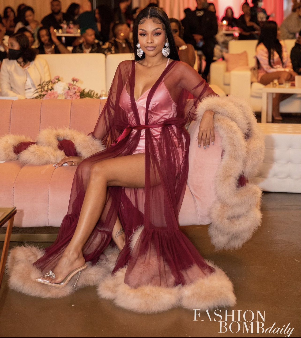 Reyna Love wore a burgundy fur-trimmed robe over a pink slip mini dress.