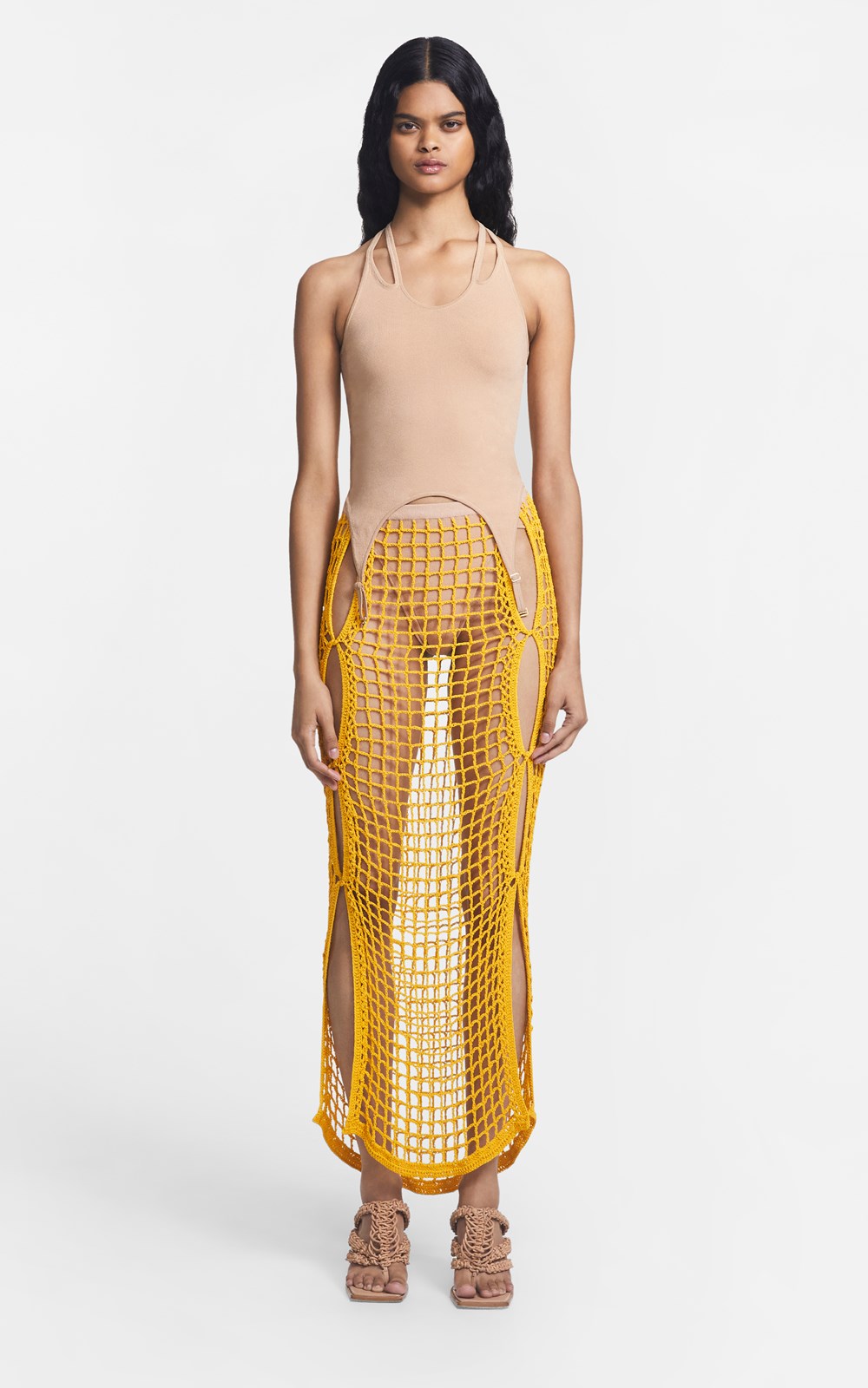 Draya Michele wore a look by Dion Lee which included the brand’s $690 Chain Crochet Skirt in sun and $290 Lustrate Fork Crop Top in timber/blonde. Both pieces are from the brand’s Spring/Summer 2021. The Chain Crochet Skirt features an attached cheeky brief lining covered by a cord yard-stitched grid overlay with cutout side seams and side split hems. The Lustrate Fork Crop Top is a sleeveless crop top that has a racerback and halterneck as well as cutouts on the chest and back.
