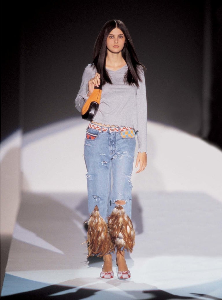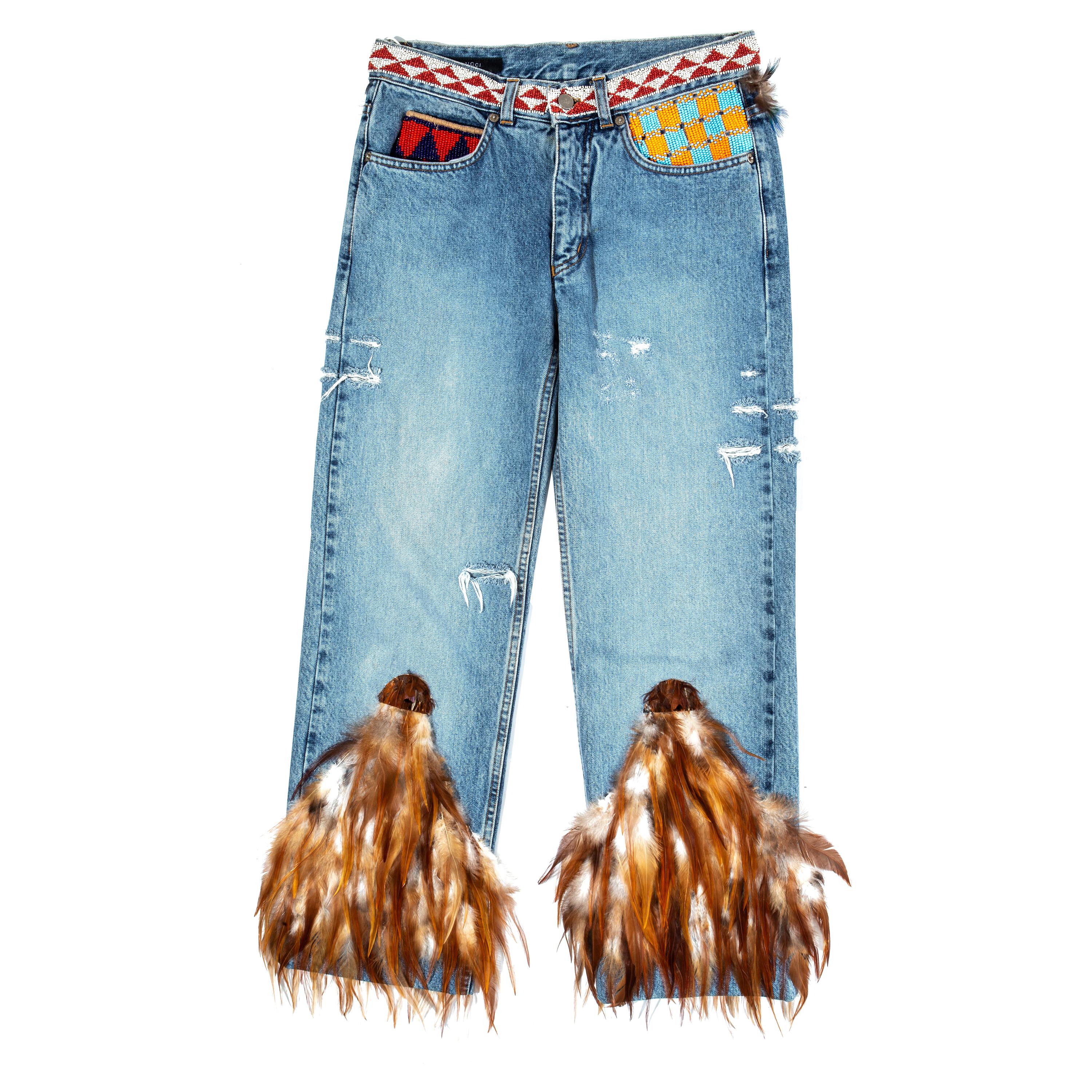 The notable piece of Rih’s look is, of course, the Gucci by Tom Ford jeans from the Spring/Summer 1999 collection. It features beaded and feather elements as well as Aztec-like designs on the back pockets. It was made in very limited quantities, so the item is considered to be extremely rare. However, being Rihanna anything is possible even something as rare as these designer jeans.