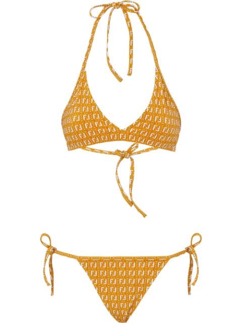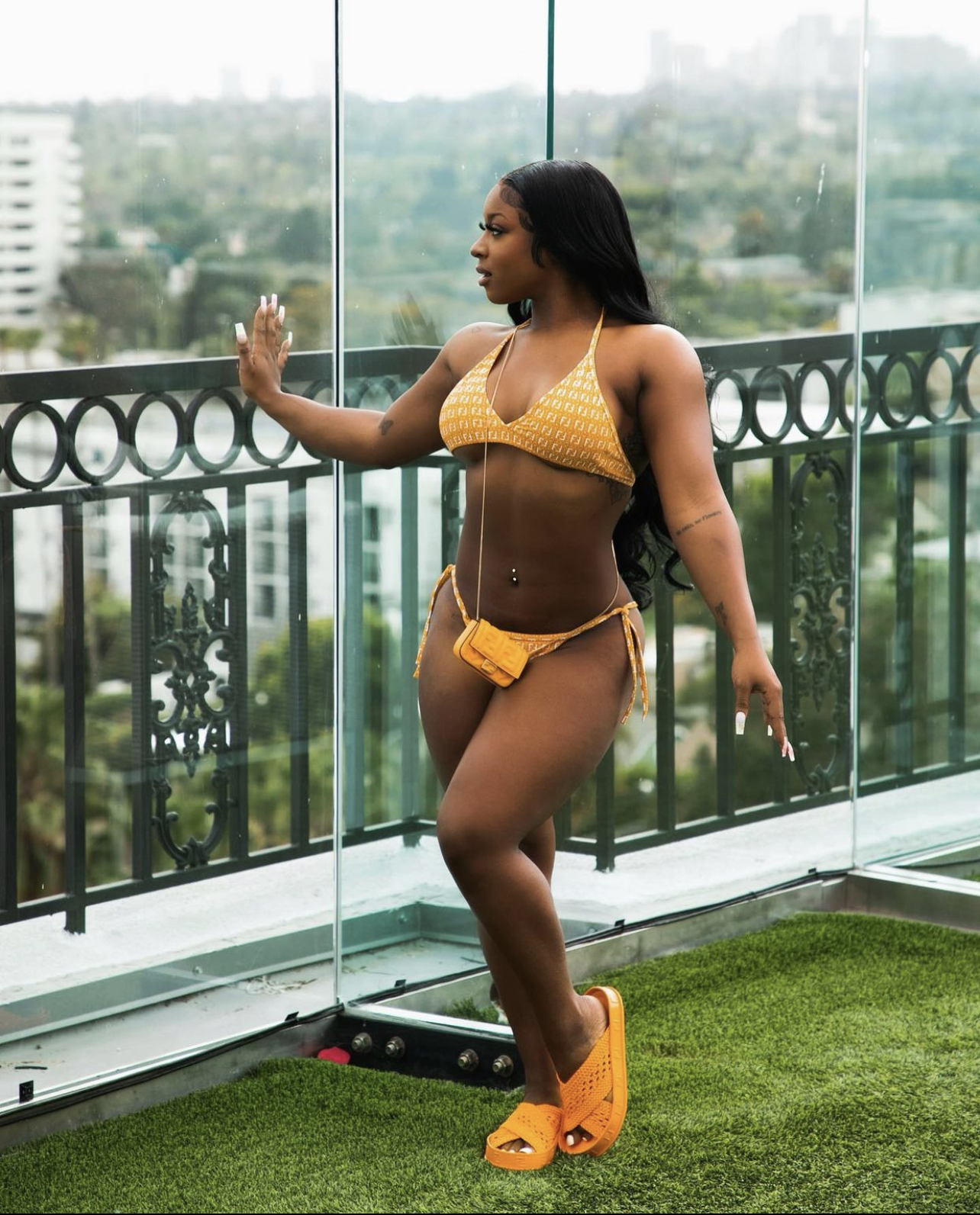 It’s a Fendi craze! Her second look was a full Fendi ensemble. She rocked the brand’s $550 FF-Pattern Triangle Bikini and $790 Reflections Slides topped off with a $2,290 Mini Baguette Woman all in orange.