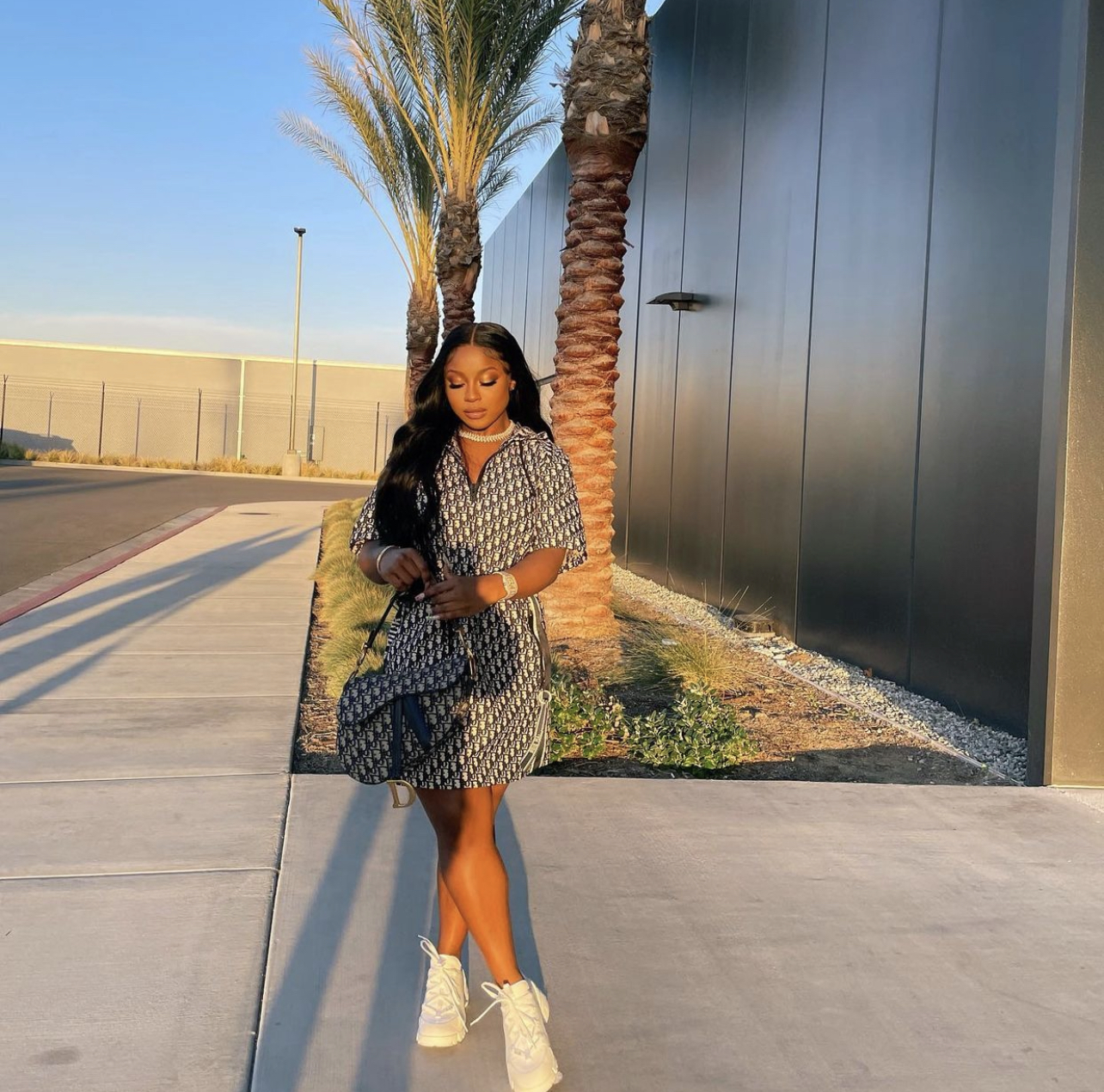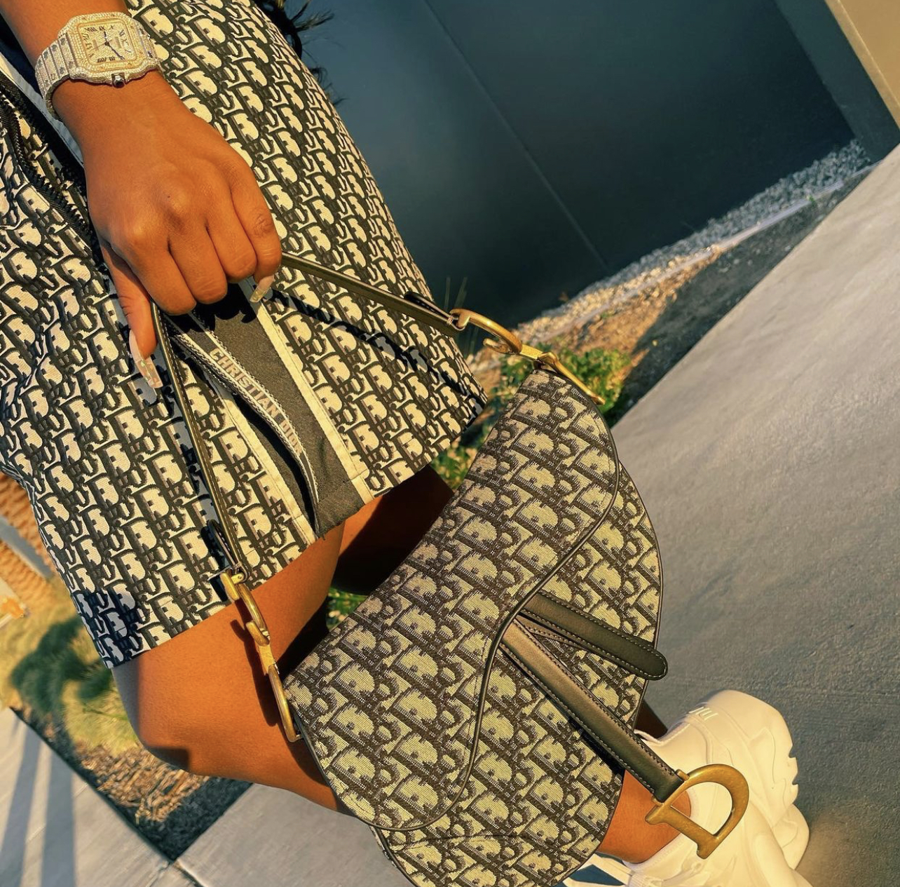 Christian Dior Dior! For the grand finale, she rocked a full Dior look which included an $3,400 Oblique Motif Short Hooded Dress and $3,800 saddle bag. She accessorized the look with white sneakers and an icy Cartier watch.