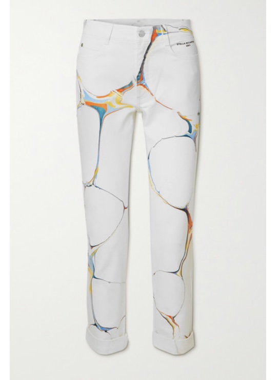 Stella McCartney’s white jeans are printed with an exuberant marbled pattern that highlight’s the designer’s free-spirited approach. They’re shaped in Italy from denim to a flattering high-rise silhouette with front patch pockets for a utilitarian twist, then fall to wide, tapered legs.