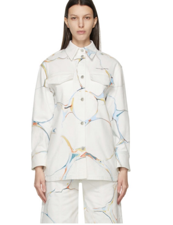 Her jacket is emblazoned with a unique and characterful marble print. It’s been made in Italy from certified organic cotton blended with a touch of stretch.