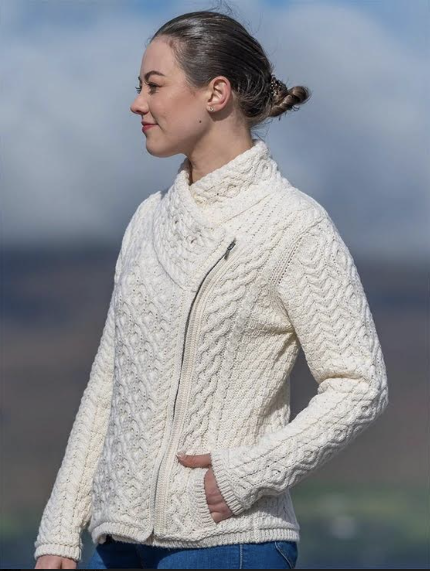 Available in two colors, Natural White and Dove Gray, this Aran Jacket will compliment any look and pair well with casual jeans or on-trend spring dresses. When you purchase a Women’s Aran Jacket With Side Zip, you will receive a signed and stamped certificate of authenticity.