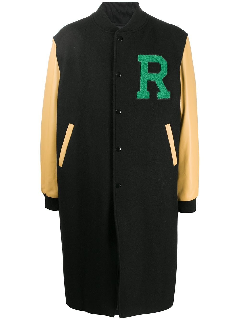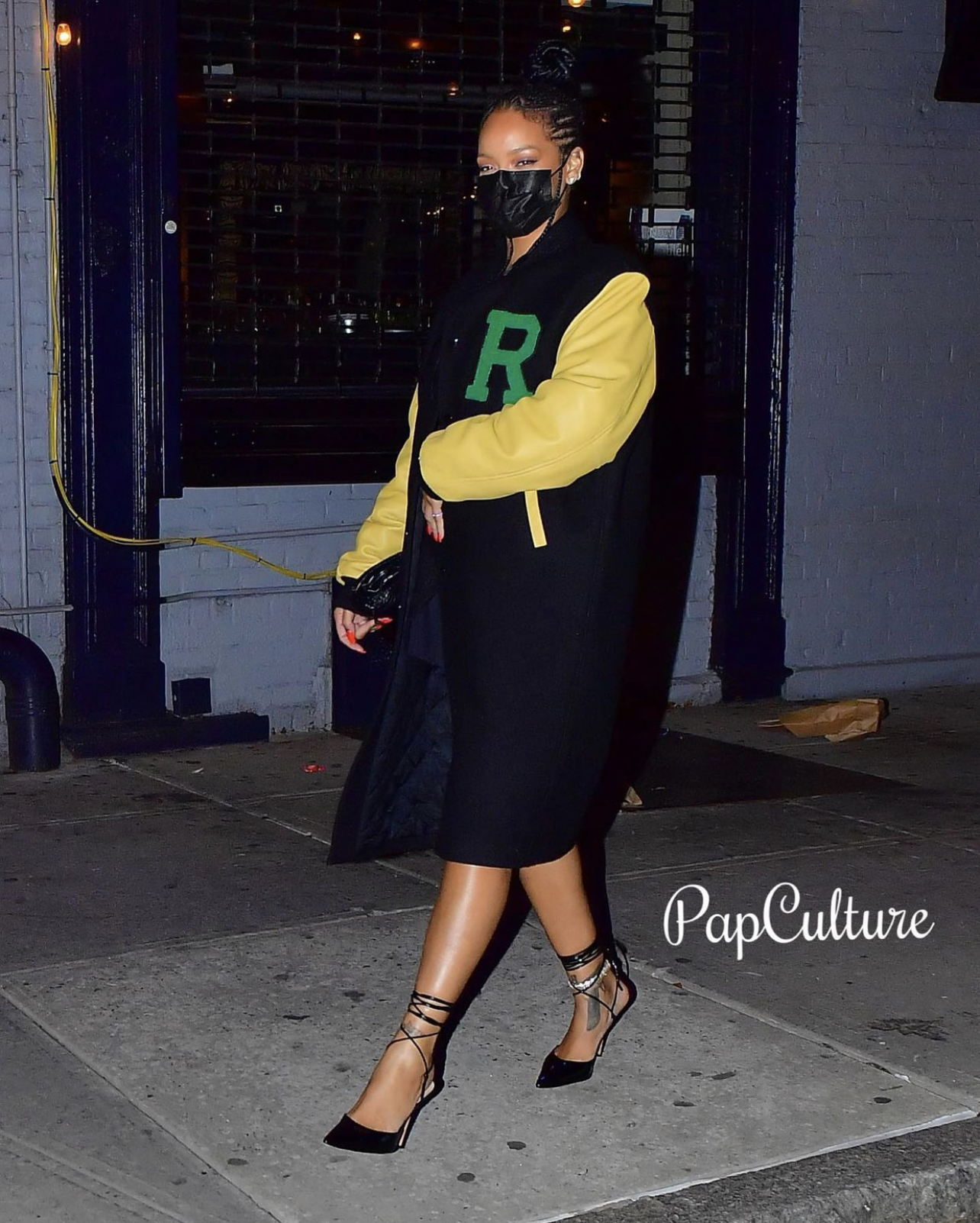 Rihanna wore the $1,340 Raf Simons American Letterman Jacket paired with a Bottega Veneta crocodile Mini Pouch (similar pictured below) and custom Manolo Blahnik shoes.