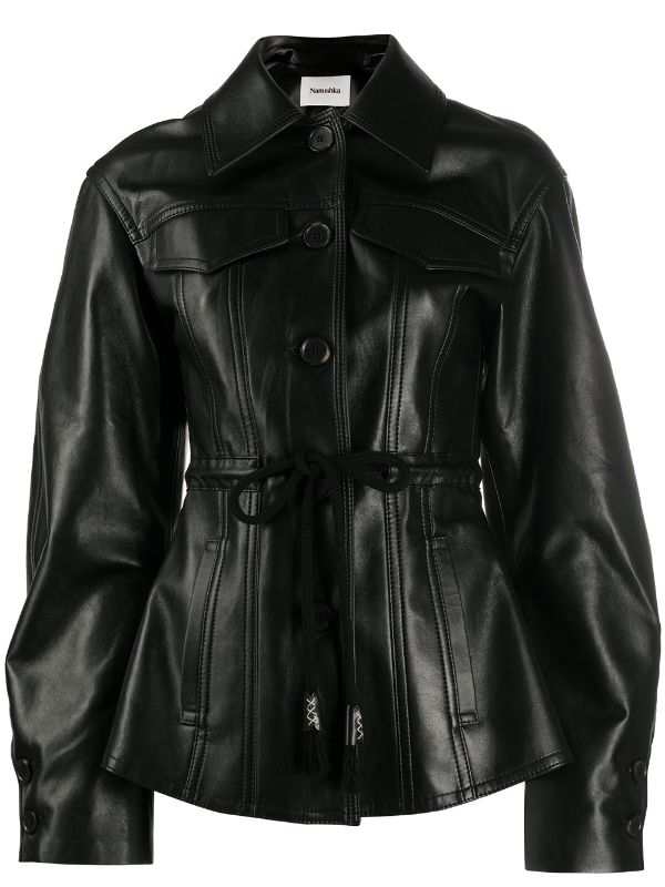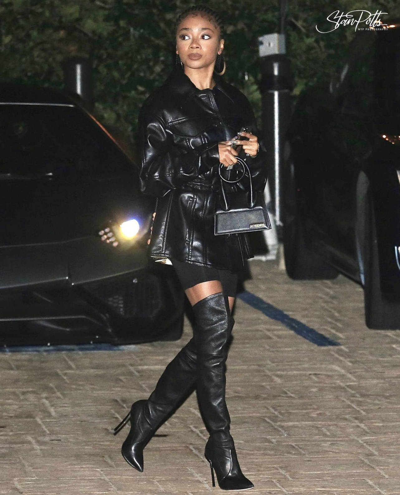 For her 19th birthday, Skai Jackson wore $965 Nanushka oversized sleeve belted leather jacket paired with black biker shorts, $1,650 Casadei blade thigh-high boots, $680 Jacquemus Le Chiquito Medium Leather Tote bag, and Lilou jewelry. Her look was styled by her go-to stylist Zadrian Smith.