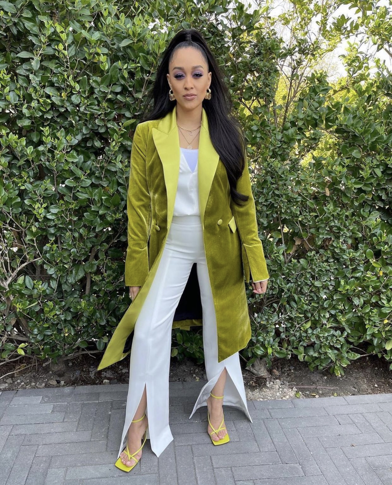 Tia Mowry has been slaying effortlessly on Instagram lately, gracing our feeds with stunning designer looks. For one look, Mowry stunned the ‘gram as she rocked a green velvet coat with a white ensemble providing us with the ultimate Spring look.