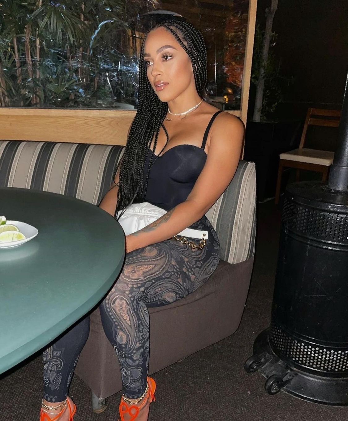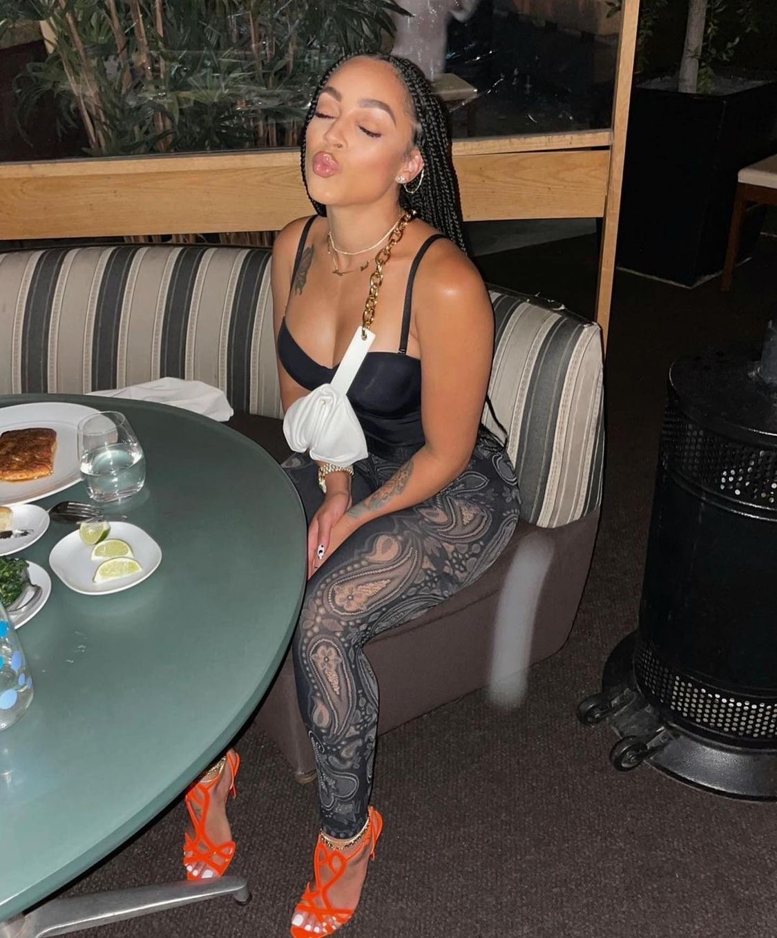 Joie Chavis was spotted on a night out wearing $250 Wolford Om Leggings in Black and $895 Christian Louboutin Double L Orange Sandals .