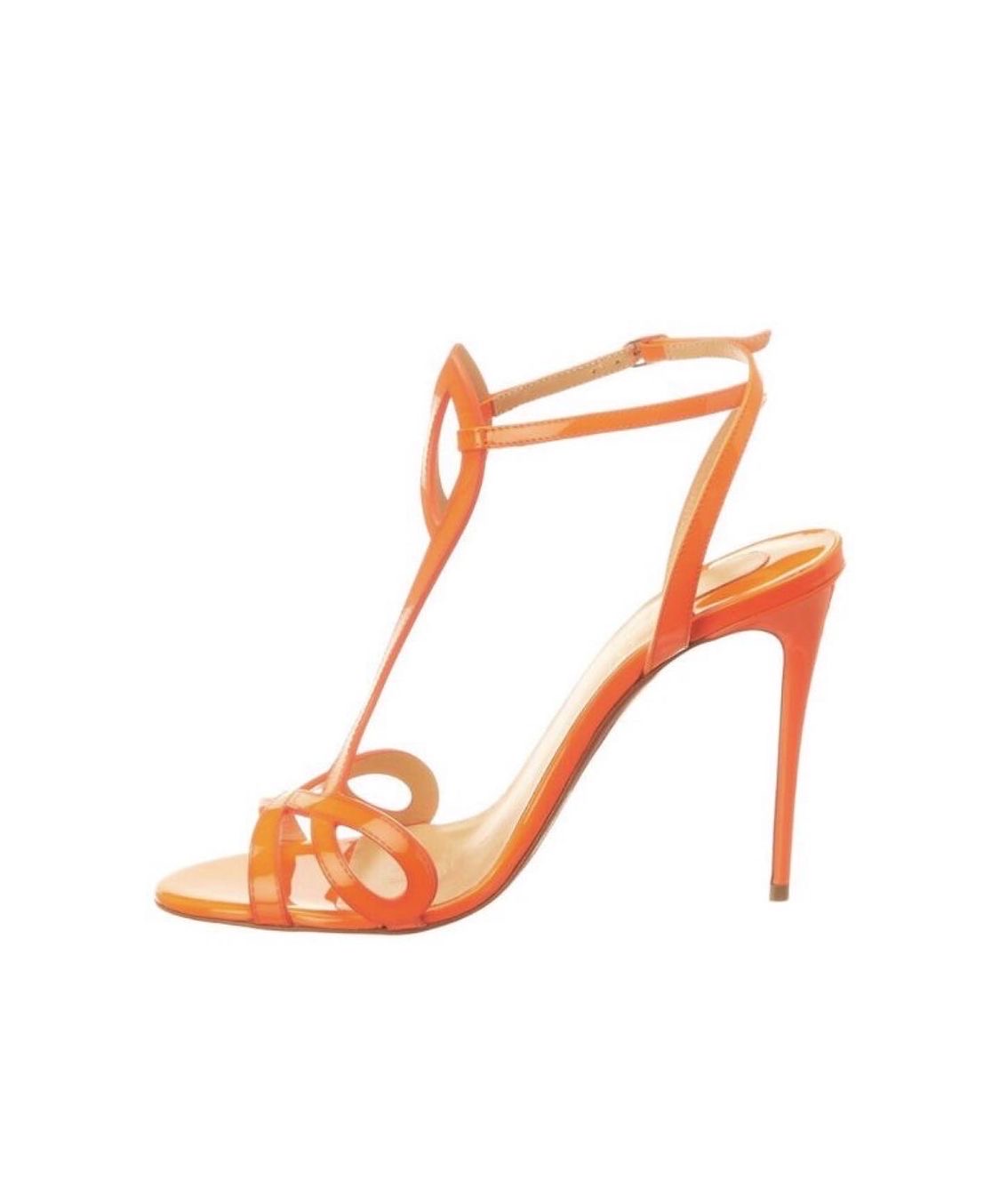 Christian Louboutin 100mm “Double L” art deco inspired patent leather sandals have a 4″ heel.