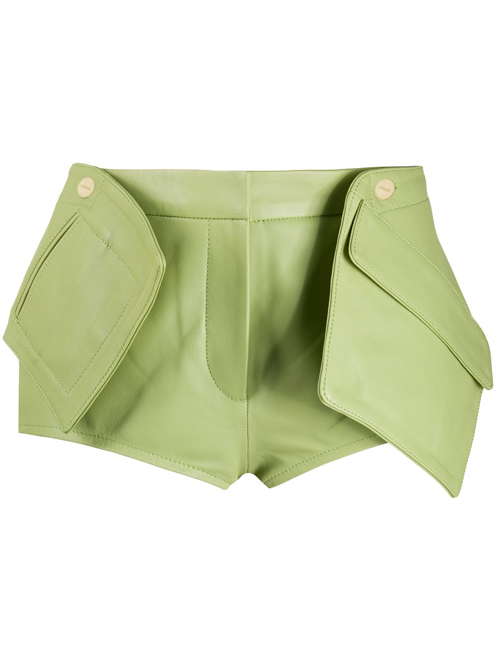 For her first look, Beyoncé wore a custom TLZ L’Femme snake print button-up shirt in baby blue paired with $524 Jacquemus green 3D pocket leather shorts and $1078 Francesco Russo Snakeskin Ankle Strap Sandals.