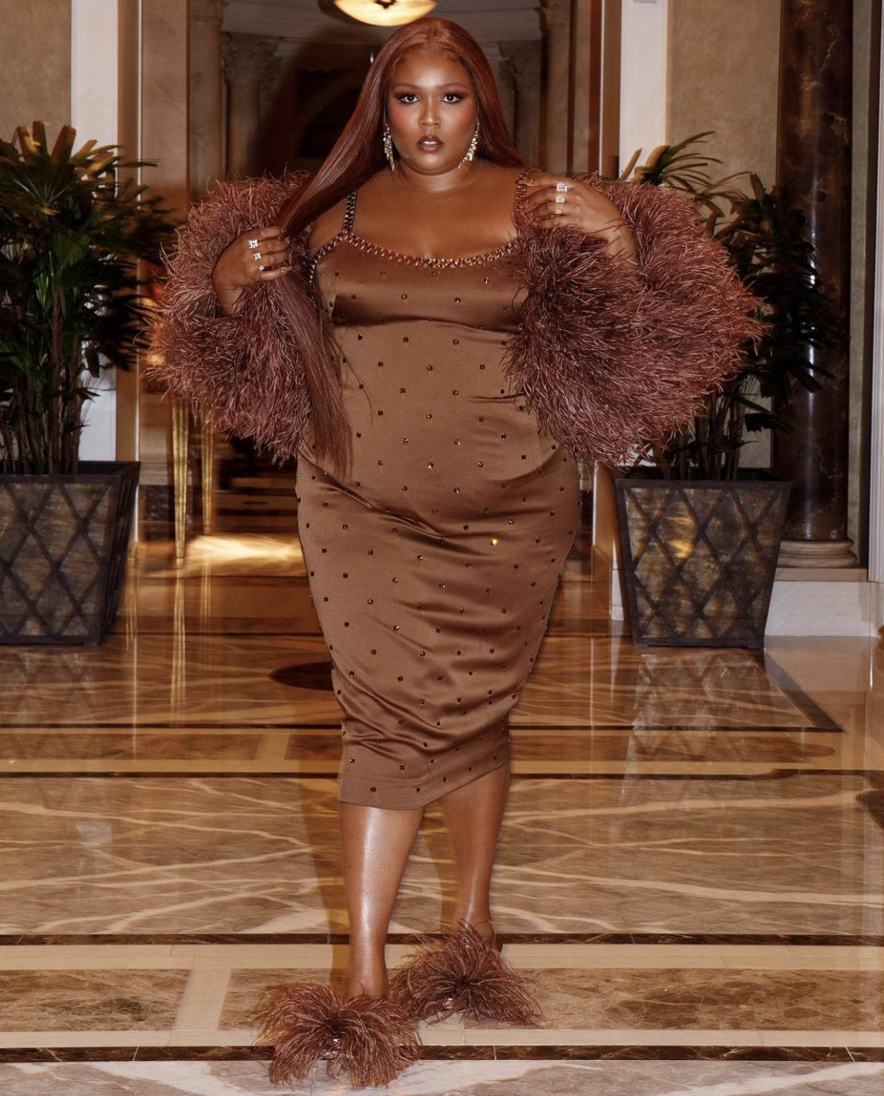She paired the Dolce and Gabbana dress with a brown feather shawl and matching brown feather mules. Jewelry hailed from House of Emmanuele and Shine Like Me.
