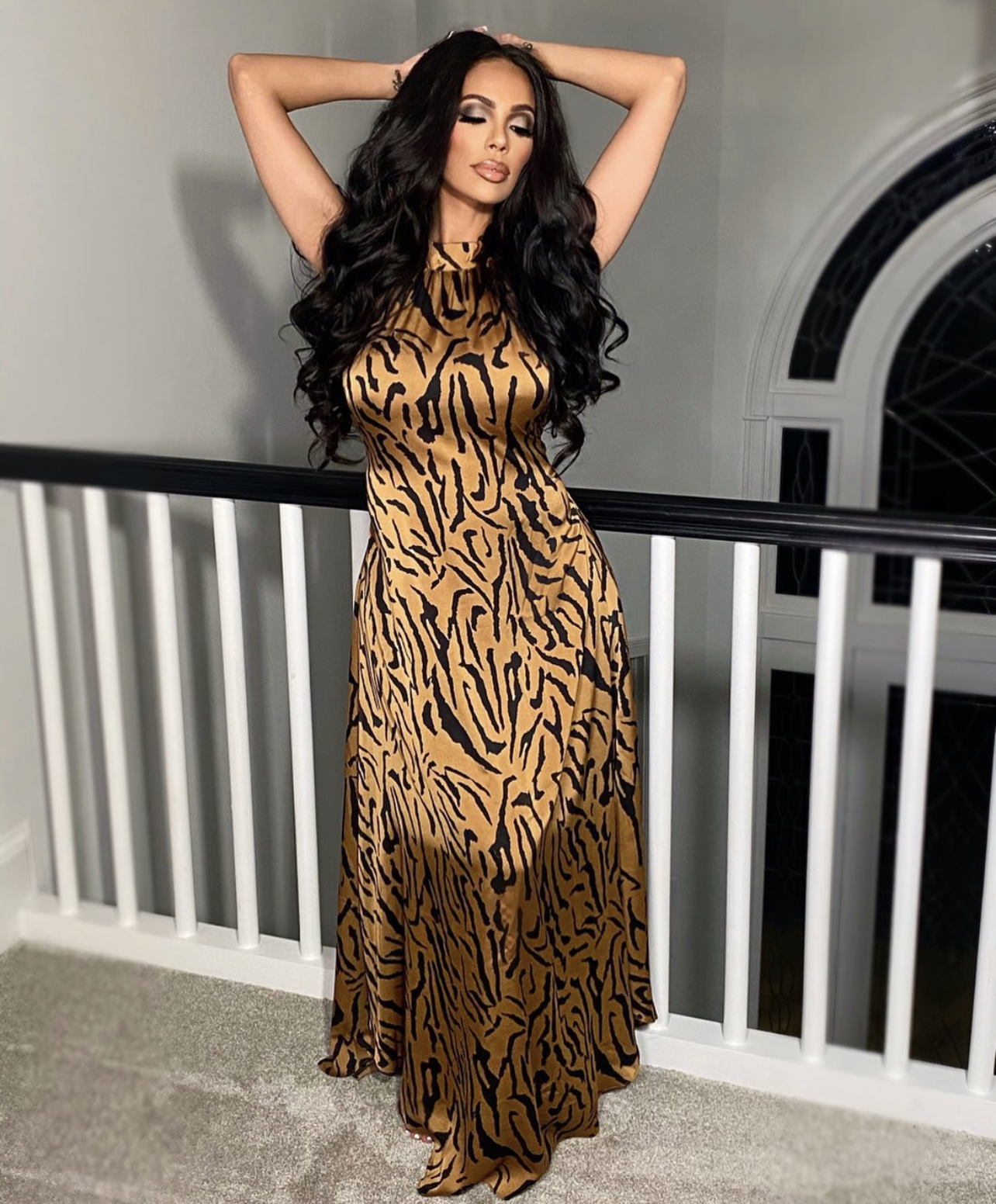 Erica Mena wore Fashion Nova’s $44.99 My Wildest Dreams Maxi Dress. The dress has a halter, high neck top complete with a maxi style skirt, self-tie belt and keyhole on the back. It appears in a bronze and brown colorway with an all-over animal-like print. Mena paired the look with a fierce makeup look featuring a smoky eye and natural lip. She also opted for body waves for her hairstyle.
