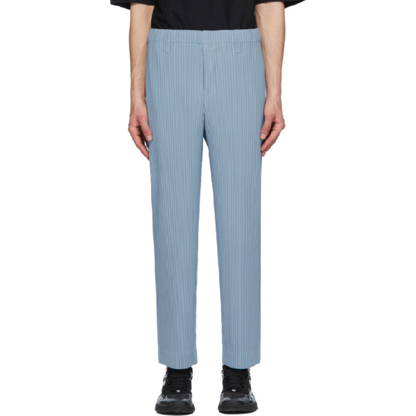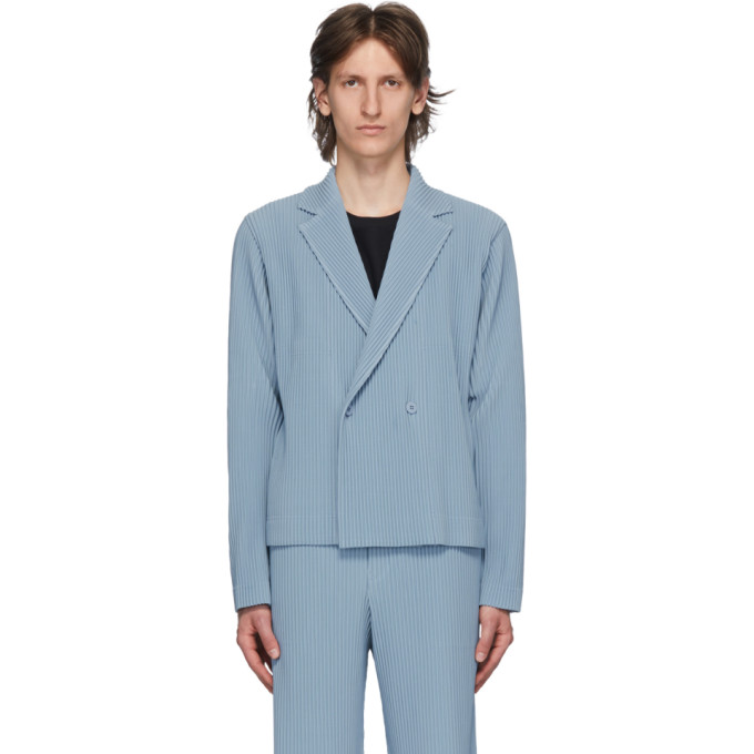 Michael B. Jordan wore a blue plissé look including a $710 suit jacket and $340 pants from Homme Plissé Issey Miyake (sold out). He paired the look with a white tee, gold chain necklaces, and what appears to be black loafers.