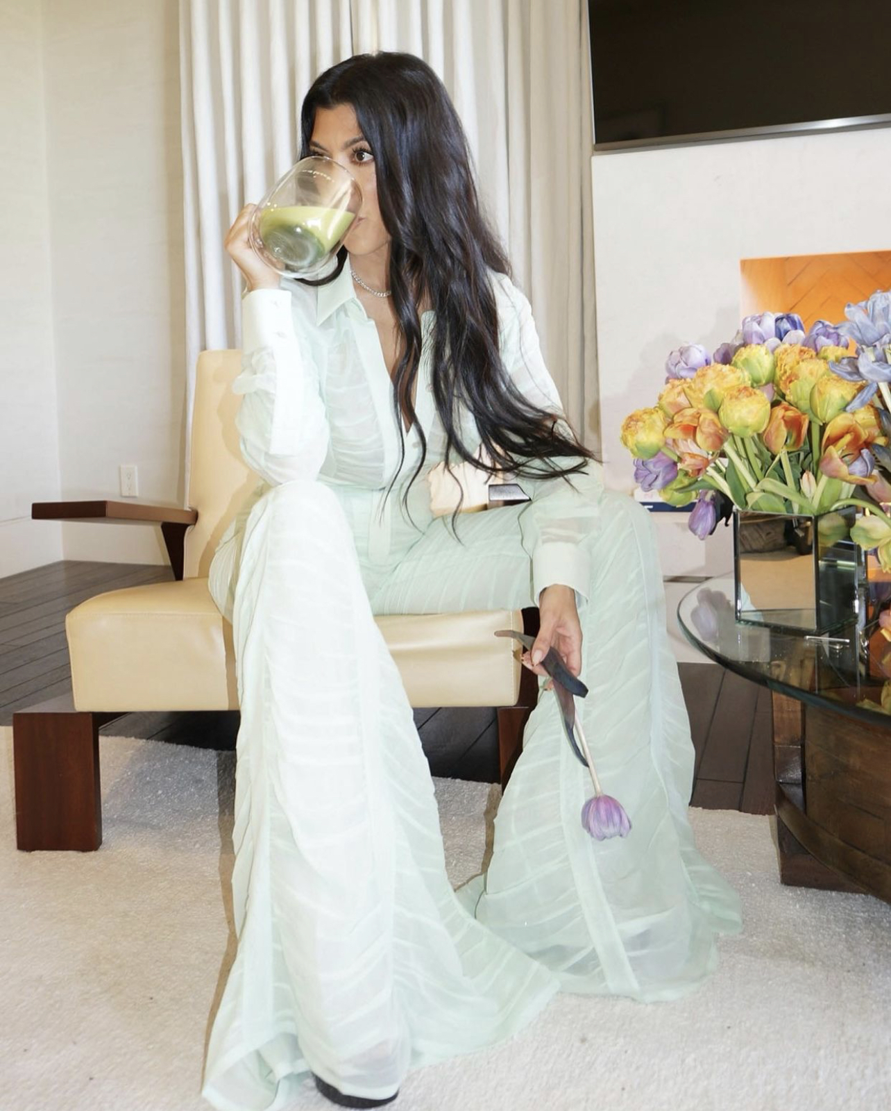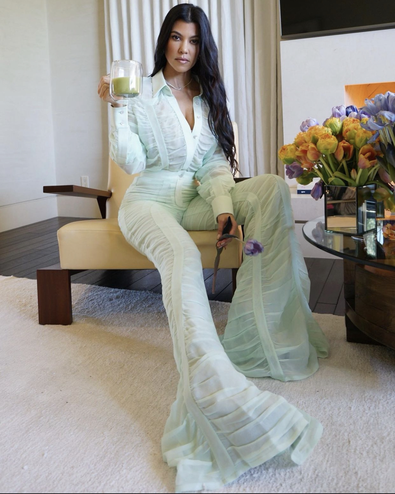 You Ask, We Answer! @ellemoraa says, “Could you please find out for us where this outfit is from ? Y’all rock!!!”, @fromtyewithlove adds, “Hi, do you know where this is from?” Kourtney Kardashian took to Instagram to promote her lifestyle brand Poosh, announcing the brand is dropping 27 new products this month. Of course, she made the announcement in the Kardashian-Jenner way donning a mint green designer look that complimented her green matcha drink in her hand.