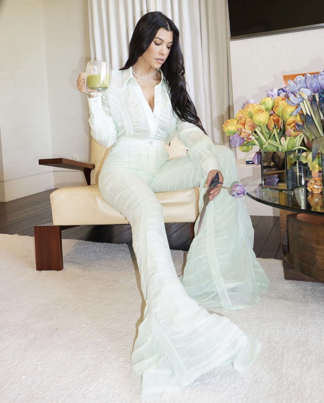 Kourtney Kardashian wore a full Salvatore Ferragamo look, styled by Dani Michelle. Her look is from the brand’s Fall/Winter 2021 collection and features a blouse and flared pants in a minty green color. Both garments appear in a sheer fabric complete with ruched detailing throughout each piece. She accessorized the look with a diamond necklace and platform heels.