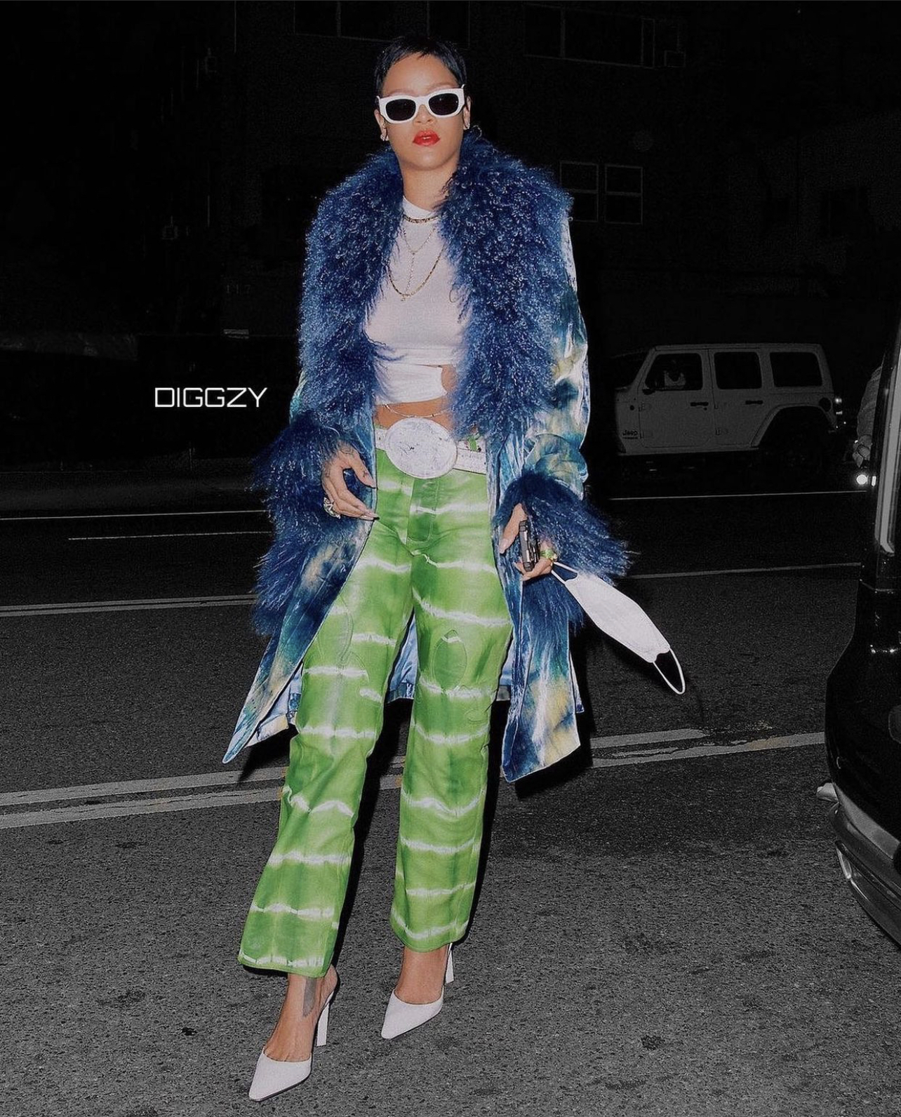Rihanna wore a Dior by John Galliano Fall 2000 coat which served as the ultimate “wow” piece for this look. The coat appears in a blue-green tie dye pattern complete with accenting blue fur which happens to be from Mongolian lamb. Being a such a showstopping vintage designer piece, it is no surprise that this very jacket sold on 1st Dibs for $22,000.