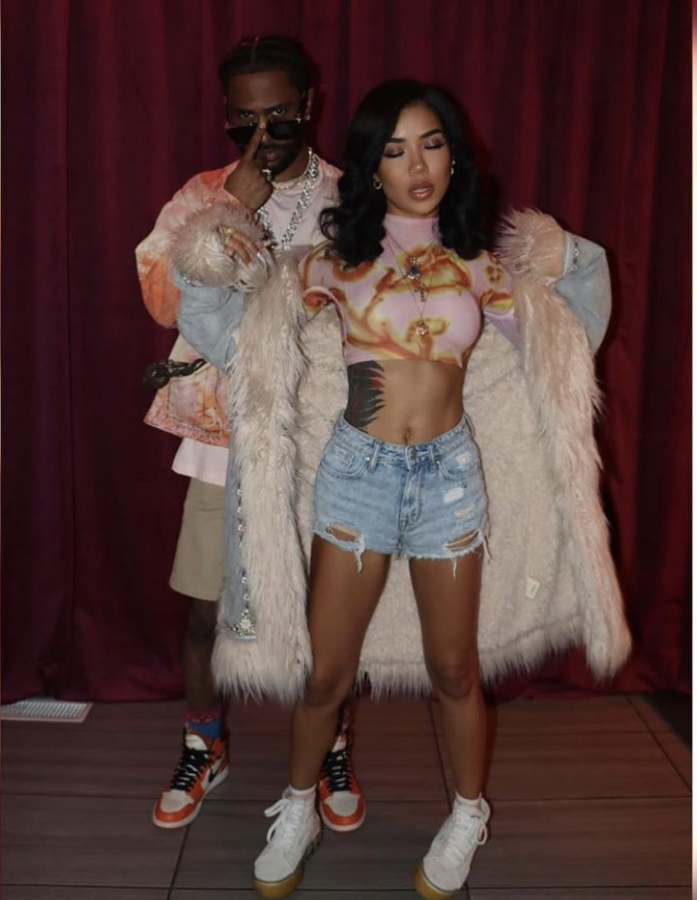 Jhene skewed casual in jean shorts, sneakers, and a fluffy jacket (styled by @x.s.studio):