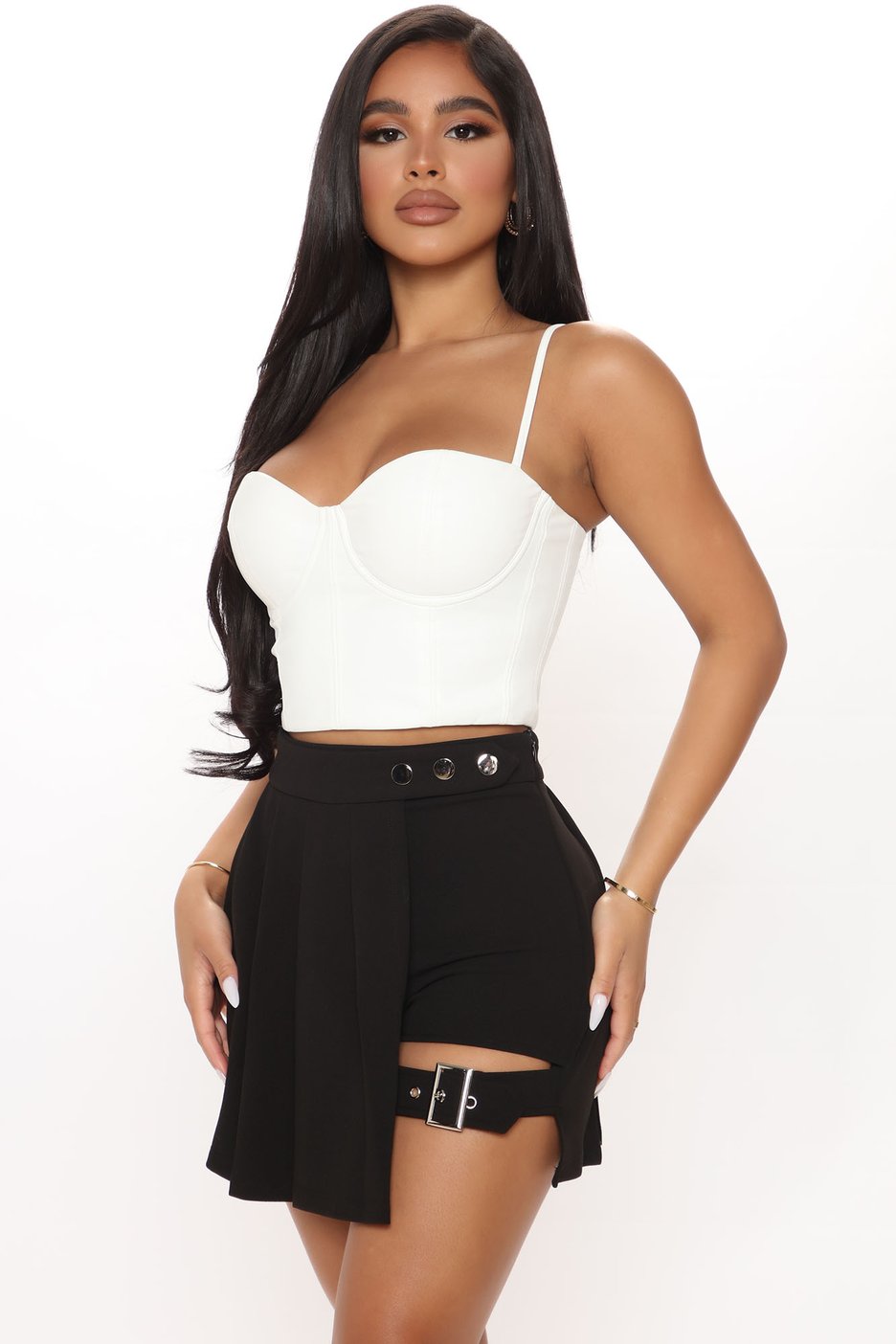 DreamDoll wore Fashion Nova’s $29.99 Bad Reputation Pleated Mini Skirt in black. First things first, this is not your typical pleated preppy skirt. This mini skirt features a half pleated skirt, half short style which essentially makes it a skort. The side with the shorts includes an edgy buckle which wraps around the thigh.