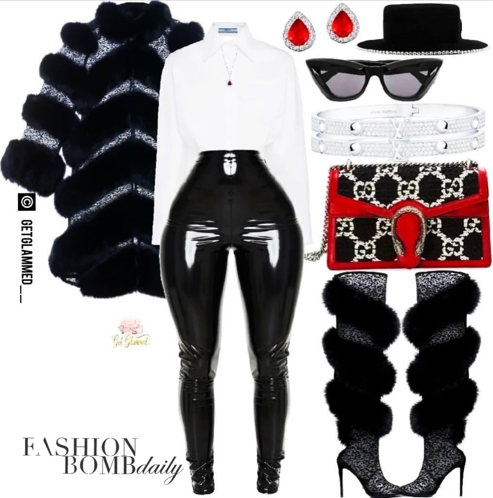 The first look, created by Get Glammed, features fierce elements like fur and crystals in black, red, and white which perfectly captures the essence of Cruella de Vil. Notable pieces of the look include the $3,500 Jennifer Le black leopard mesh fox fur coat and $1,150 over-the-knee boots along with $590 Ruslan Baginskiy crystal-embellished hat, $1,355 Gucci Dionysus tweed shoulder bag, and $32,000 Louis Vuitton Empreinte bangles. You can shop a similar look below: