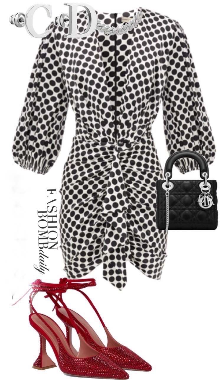 Curated by Fly Sh*t Only, the second look tackles the character’s signature color palette with a $1,014 silk-satin polka dot mini dress by Alexandre Vauthier and $1,201 Amina Muaddi “Karma” embellished suede pumps. Accessories include Dior’s $4,300 mini Lady Dior bag and $370 “C” and “D” earrings. Shop the look below: