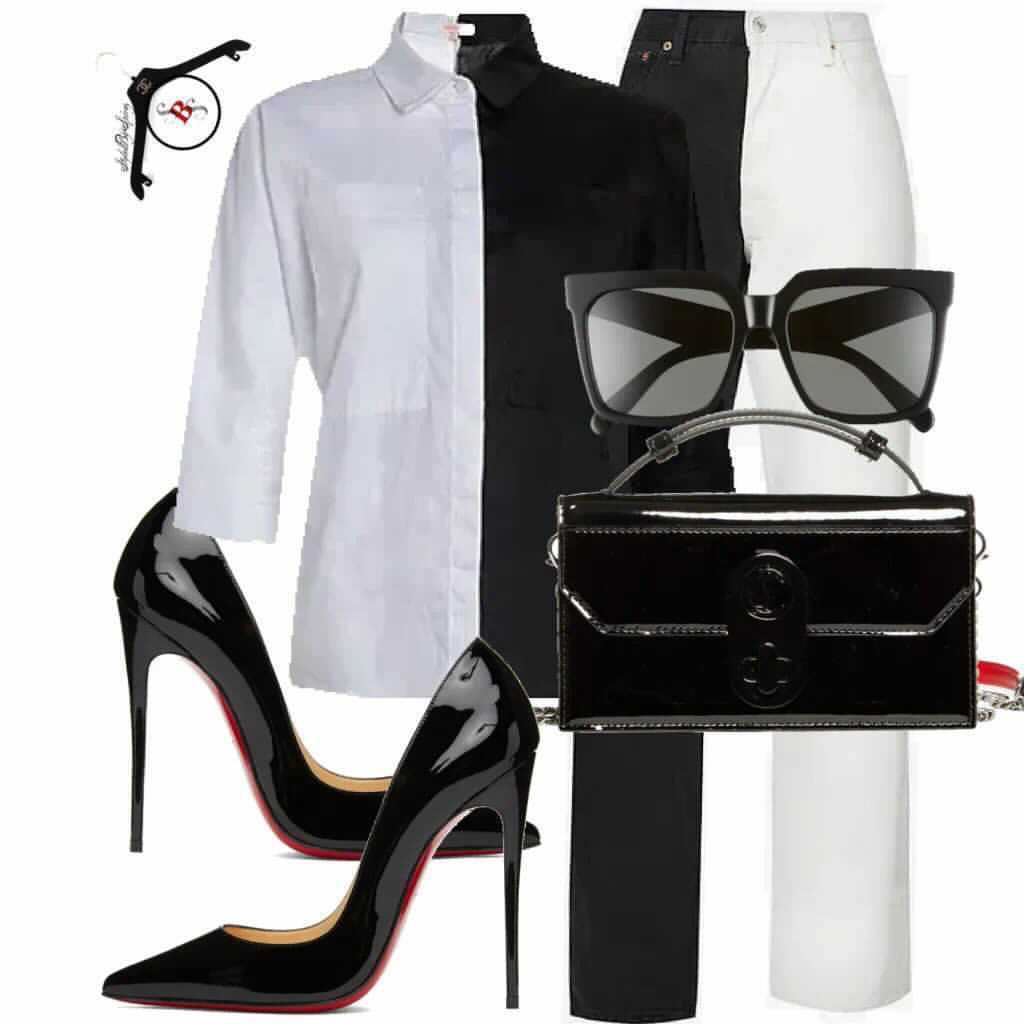Keep it classy and mimic Cruella de Vil’s chic split-tone black and white hairdo with your look. Based on the look above by Styled by Spivey, you can achieve this colorblock look with a split color shirt and pants paired with black and red accessories like the patent leather Louboutin pumps and coordinating handbag. Shop a similar fit below: