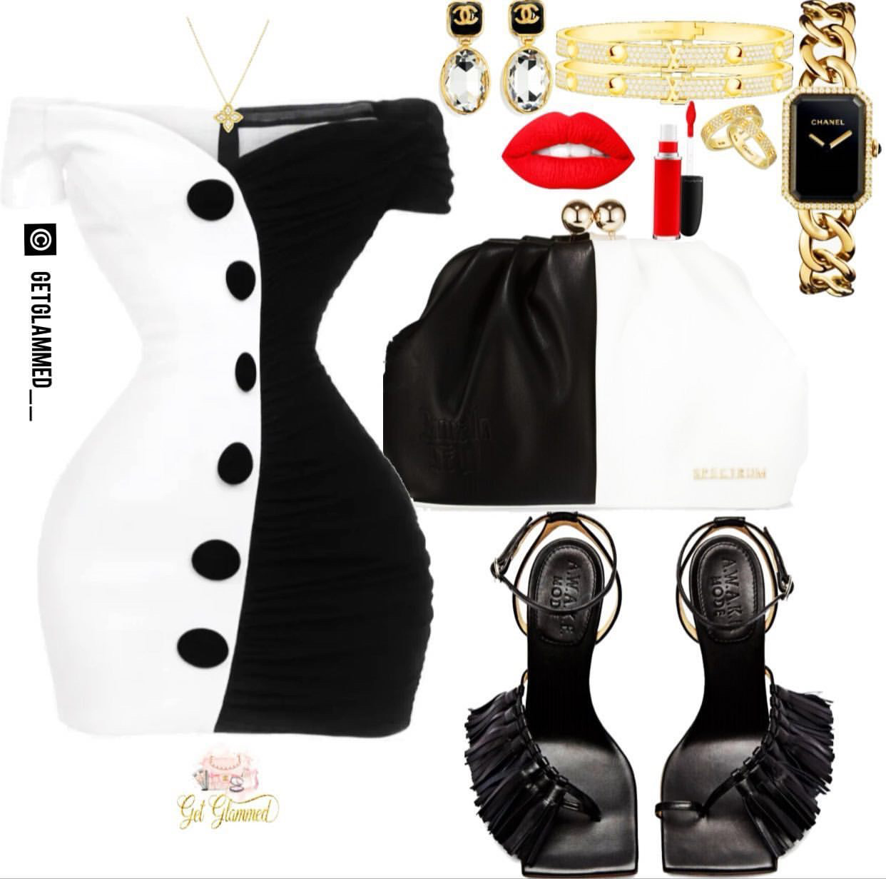 Let’s get into another colorblock ensemble but with more glam! Curated by Get Glammed, you can also achieve the split-tone look with a dress and bag like the ones above by Balmain and Spectrum, respectively. Get even more fashionable with a pair of eye-catching heels like the pair of fringe sandals by Awake Mode. Accessorize the look with gold and red accessories similar to the Chanel ones above and finish off with a bold red lip. Grab a comparable look below: