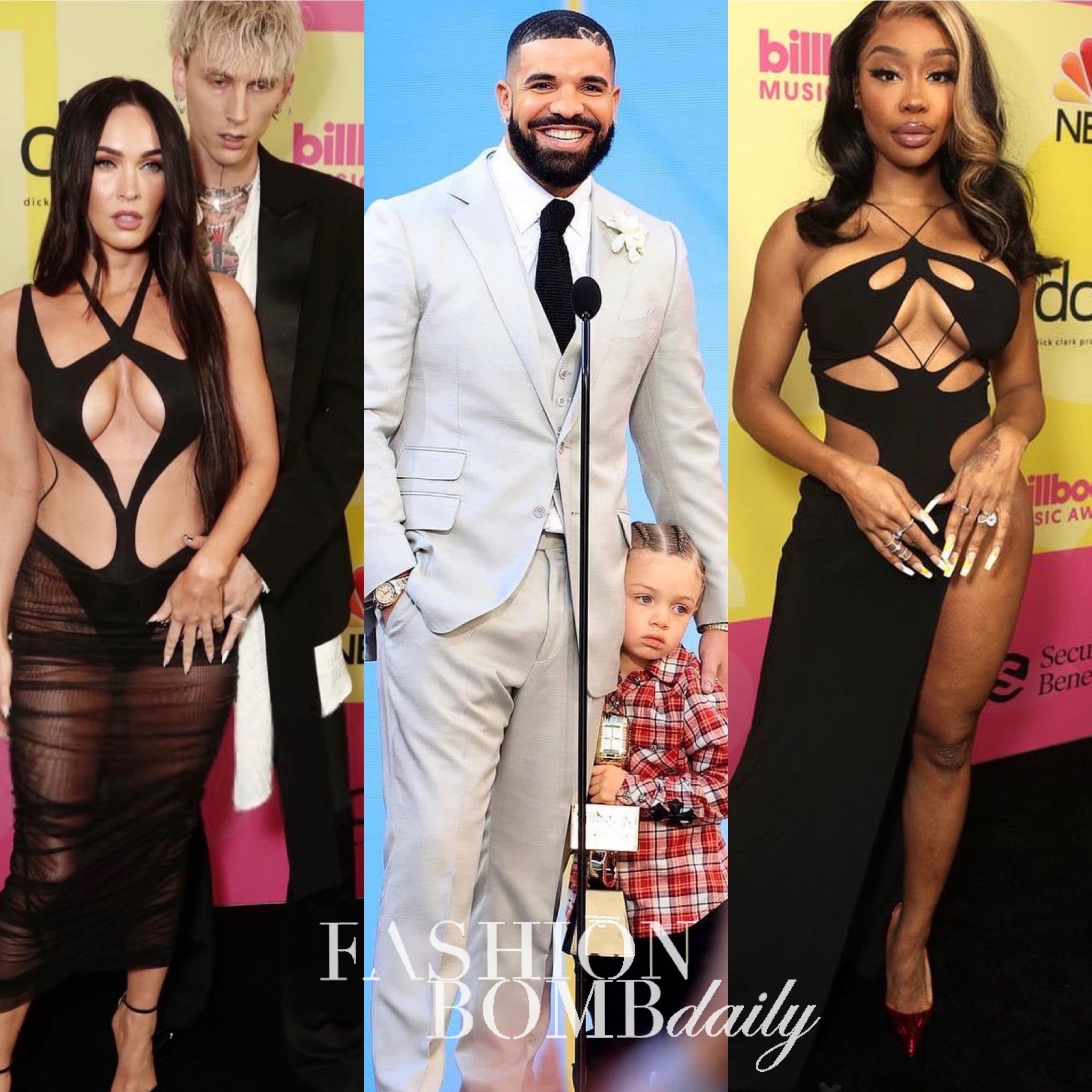Megan Fox and her boyfriend Machine Gun Kelly gave us a Fashion Bomb Couple moment on the red carpet! Megan Fox wore a Mugler look from the brand’s Spring 2021 collection, styled by Maeve Reilly. Her dress included a cutout top along with a mesh midi skirt. On the other hand, Machine Gun Kelly wore a Balmain Spring/Summer 2021 look, styled by Adam Ballheim. The 2021 Billboard Top Rock Artist’s look included an asymmetrical white button top along with a black blazer with extended panels and flared leg trousers.