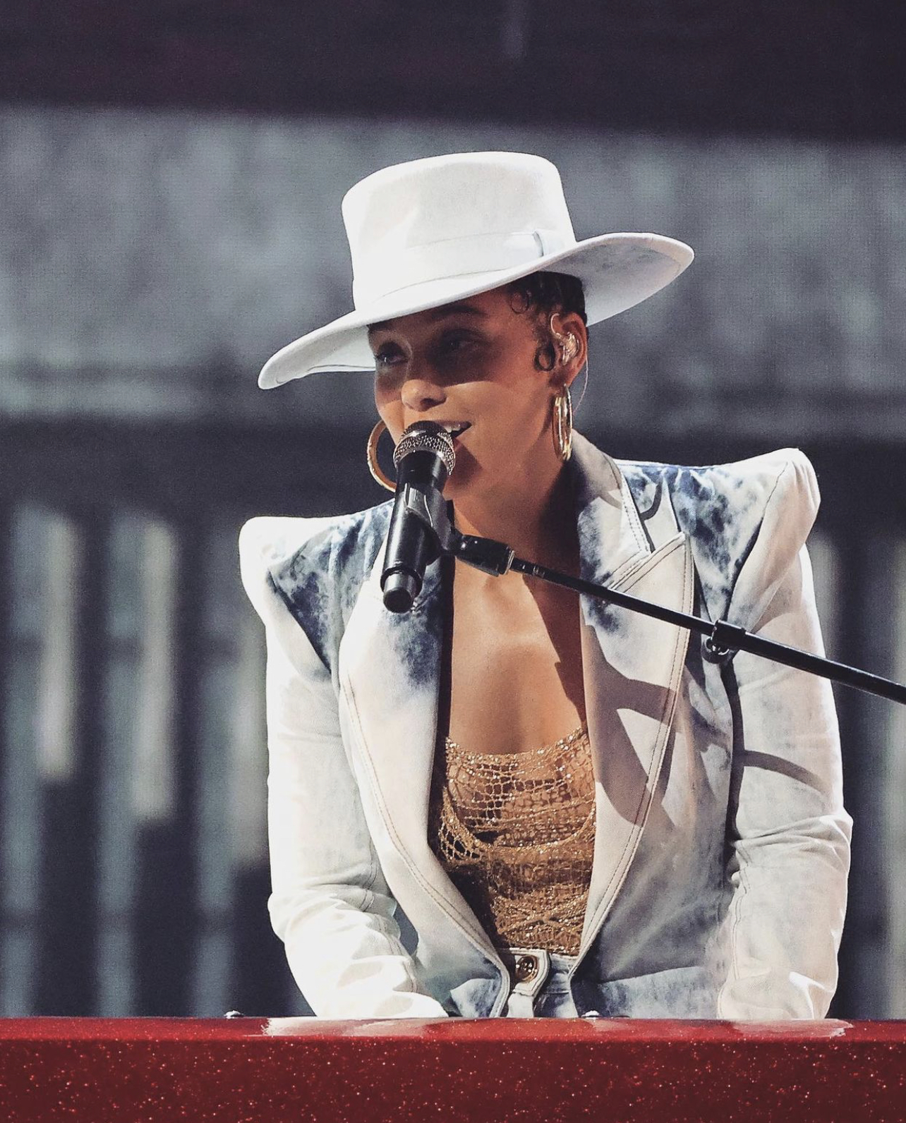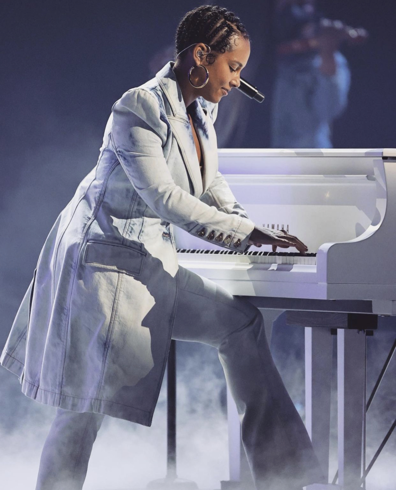 Alicia Keys performed and celebrated 20 years of her debut album Songs in A Minor wearing a custom Balmain look and a Natalia Fedner corset during the 2021 Billboard Music Awards, styled by Jason Bolden. Her Balmain look included a custom single-breasted jacket with exaggerated sleeves, a hat, and a pair of bootcut jeans in the light-washed denim fabric. She paired the Balmain pieces with a custom chain resin corset by Natalia Fedner.