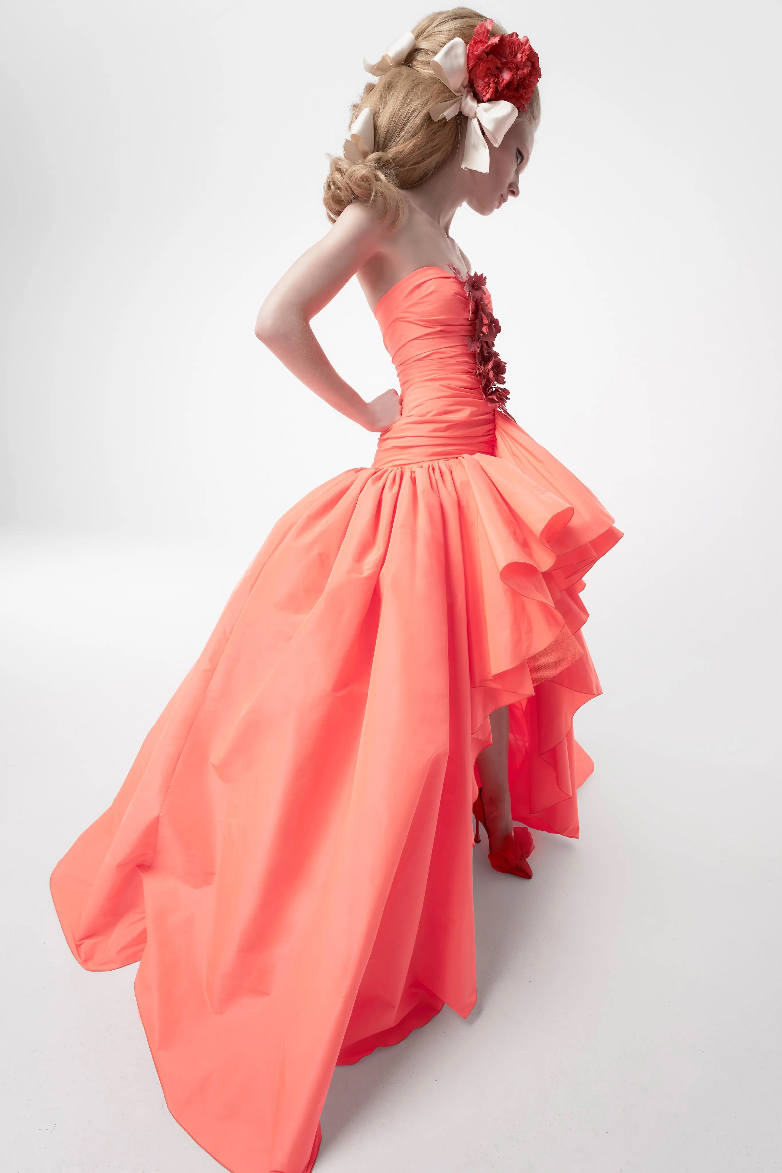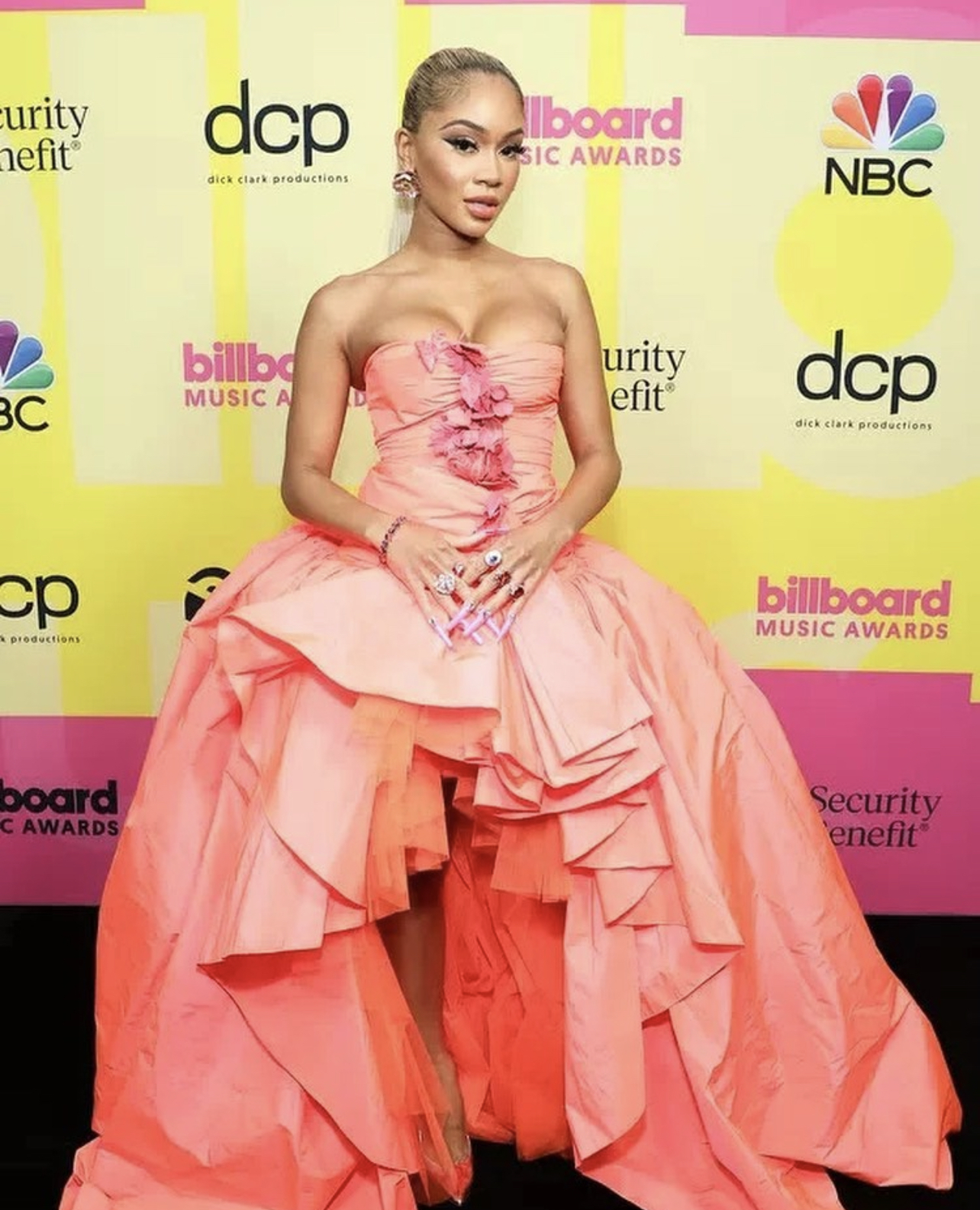 The icy princess aka Saweetie appeared on the red carpet in Giambattista Valli, styled by Wilford Lenov and assisted by Kyle Hayes. Her strapless orange high-low gown is from the brand’s Haute Couture Spring 2021 collection and features delicate details such as revealing tulle underneath the skirt and floral trim on the top. She paired the look with a pair of Casadei silver pumps and Anabela Chan jewelry.