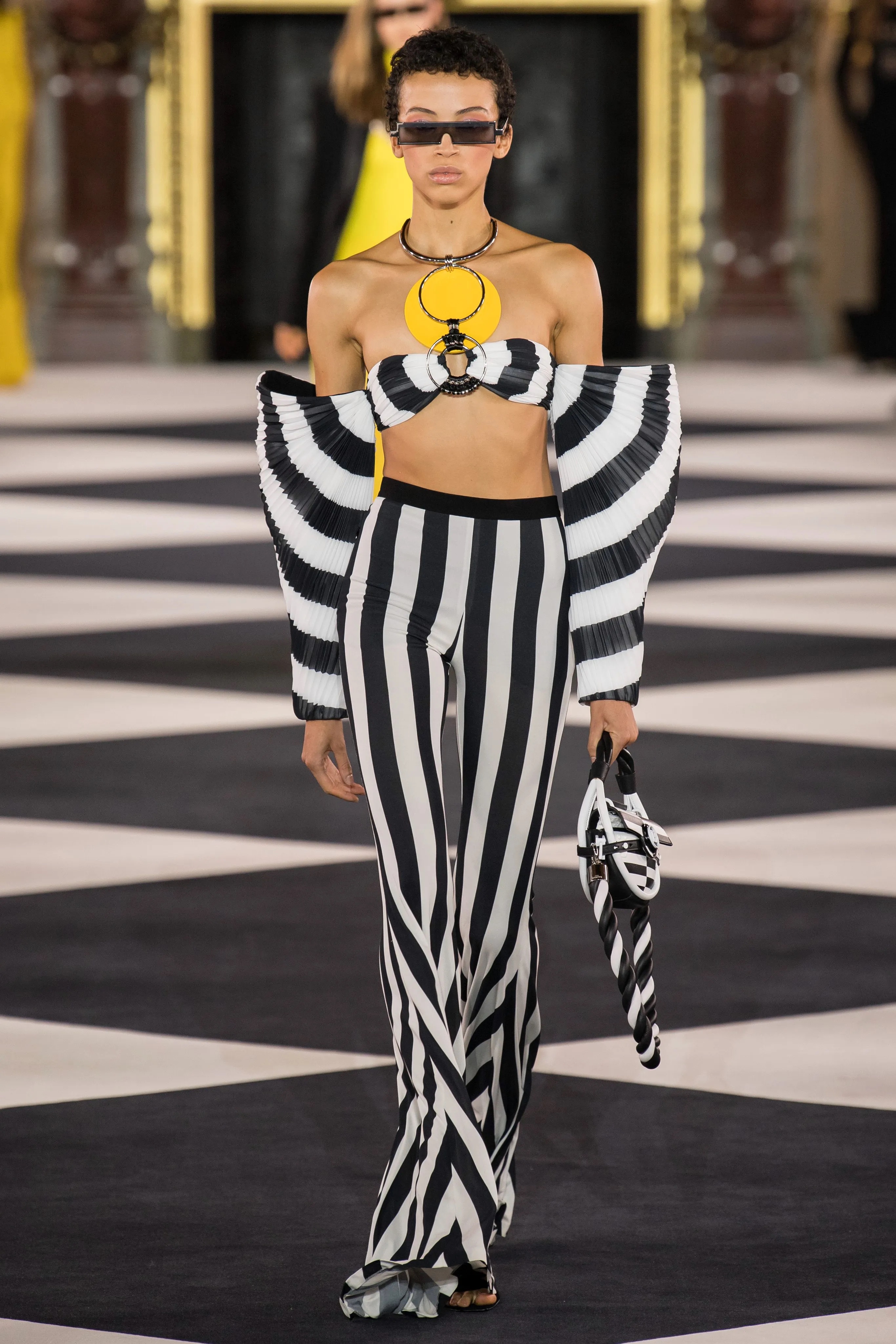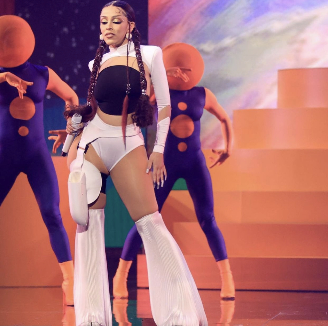 Doja Cat walked the red carpet and performed in looks by Balmain. For her red carpet look, she wore a striped jeweled crop off-the-shoulder top and matching flared pants from the brand’s Spring 2020 RTW collection. For her performance with SZA, she wore a black and white mesh panel Balmain Spring/Summer 2020 bodysuit and Maison Margiela pieces along with a custom Chrishabana strap on mic holder and custom Lillian Shalom black and white bubble earrings. Both looks were styled by Brett Alan Nelson.