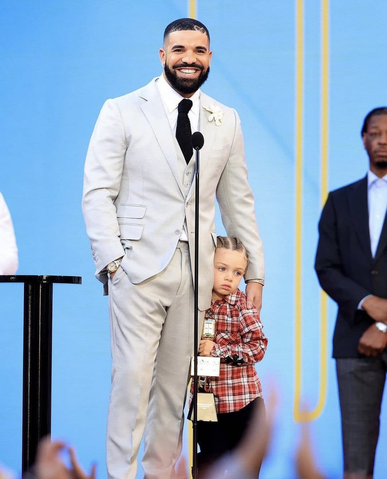 Drake, accompanied by his son Adonis, accepted the Billboard Artist of the Decade award wearing a Tom Ford suit. Dubbed as the “O’Connor” suit, the custom Tom Ford three-piece suit appears in a custom ice grey color. The look also featured a white French cuff shirt with diamond and black onyx cufflinks, a tie, and the brand’s Gianni leather boots.