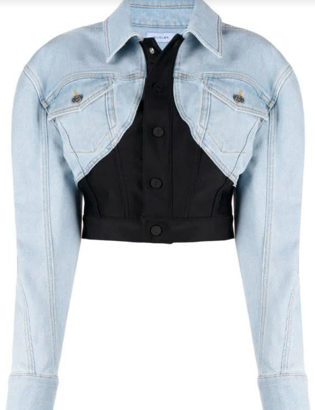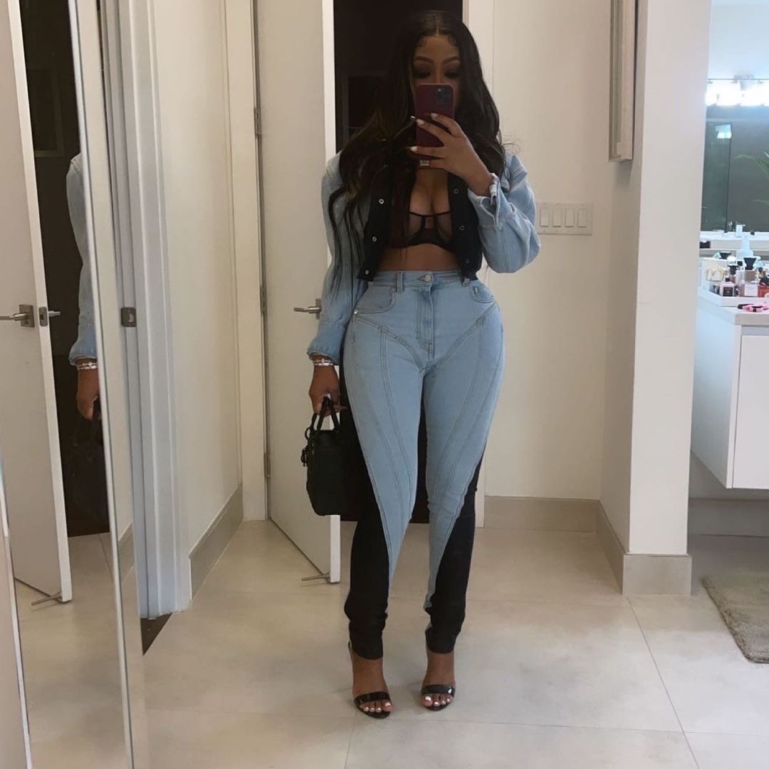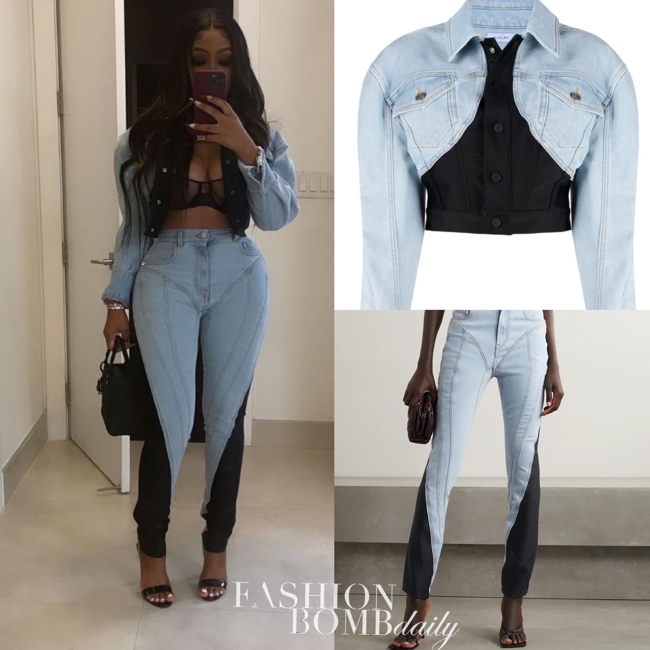 Yung Miami posted a flick wearing a $1,140 Mugler denim jacket and $690 Colorblock Jeans: