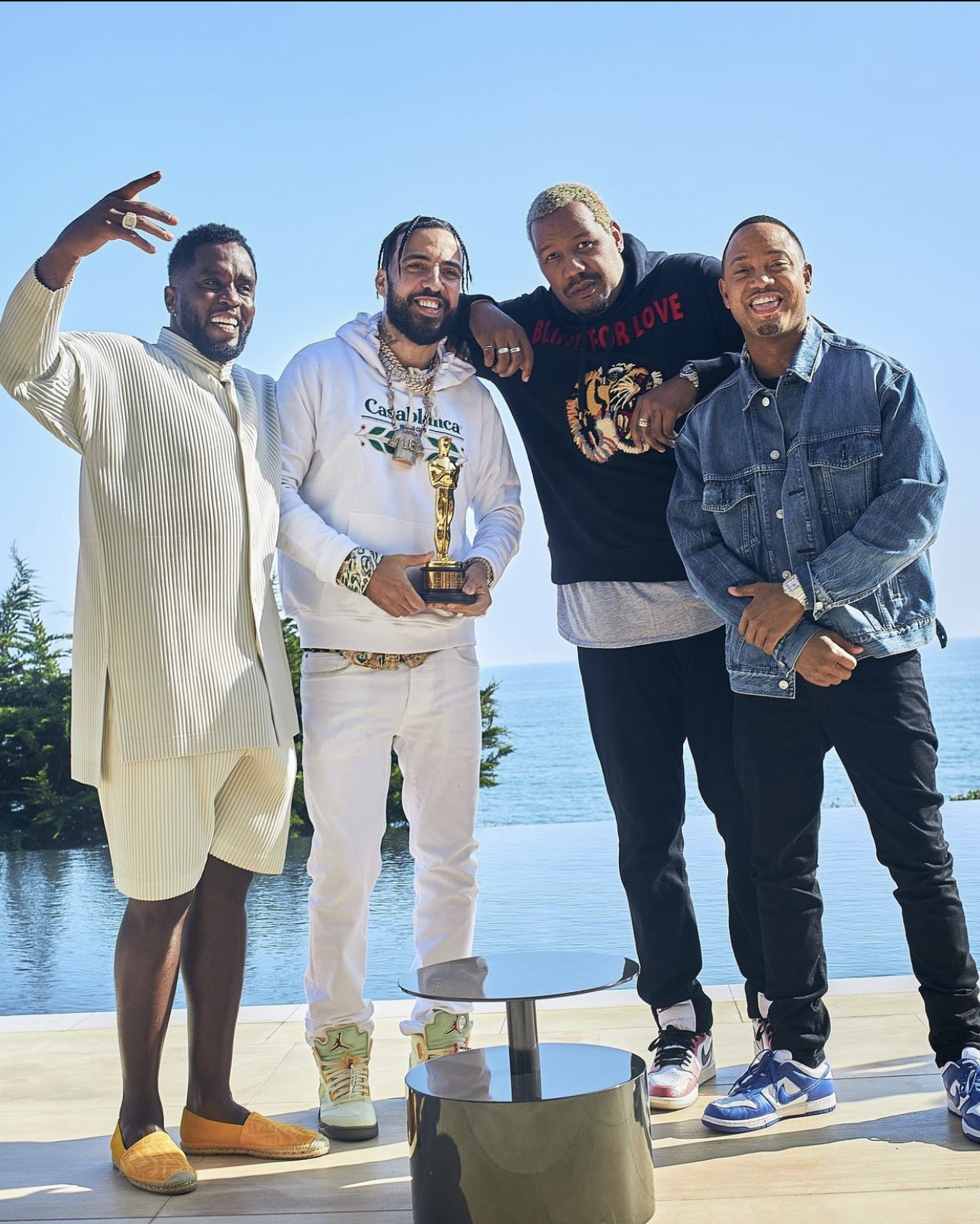 Diddy, French Montana, Two Distant Strangers director Travon Free and Terrence J grabbed a quick flick together. French Montana wore a $385 Casablanca white logo hoodie and white jeans with Off-White x Air Jordan 5 “Sail sneakers. Travon wore a Gucci “Blind for Love” hoodie (sold out) paired with black pants and Trophy Room x Air Jordan 1 “Freeze Out” sneakers. Terrence J opted for all-black with a denim jacket and Nike Dunk Low “Kentucky” sneakers.