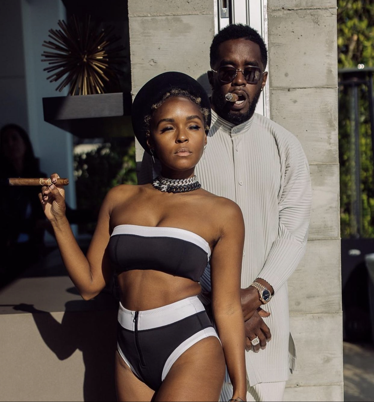 Janelle Monae wore a Gigi C “Eddie” bandeau bikini ($120 top and $128 bottom) while she posed with Diddy.