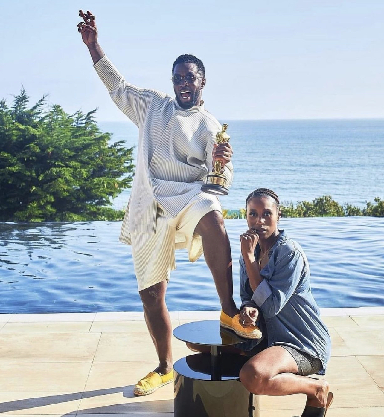 Issa Rae, who co-hosted the function, struck a pose with Diddy in a denim shirt tunic, shorts and sandals.