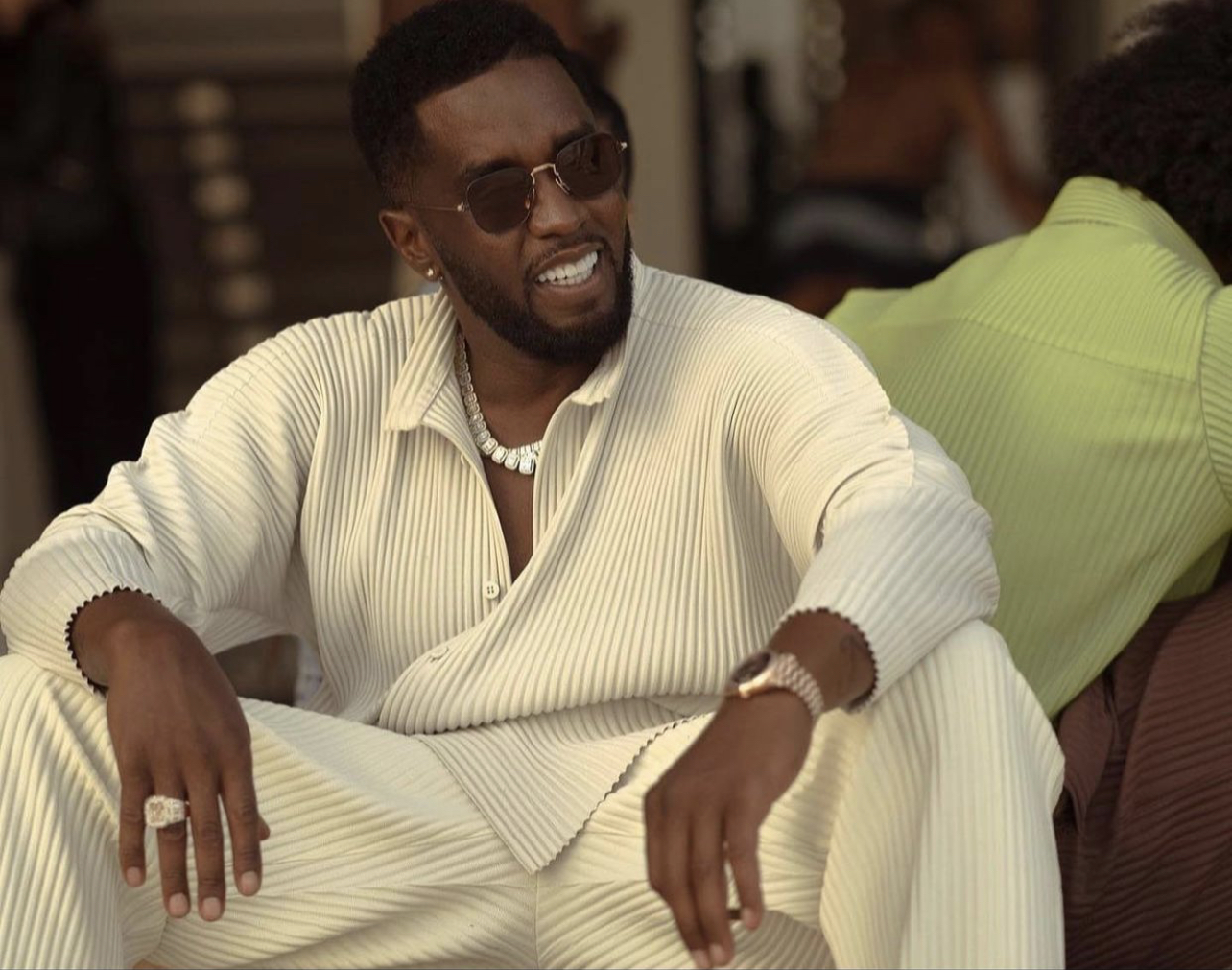 For the event, Diddy wore a look by Homme Plissé Issey Miyake including a $463 collarless button shirt and tapered trousers (sold out). As the evening went on, he switched to a pair of plissé shorts also by Homme Plissé Issey Miyake. He complete the look with a pair of sunglasses, an icy necklace and $530 Fendi yellow fabric and suede espadrilles. His look was styled by Jun Choi and Lade Aiyeku.