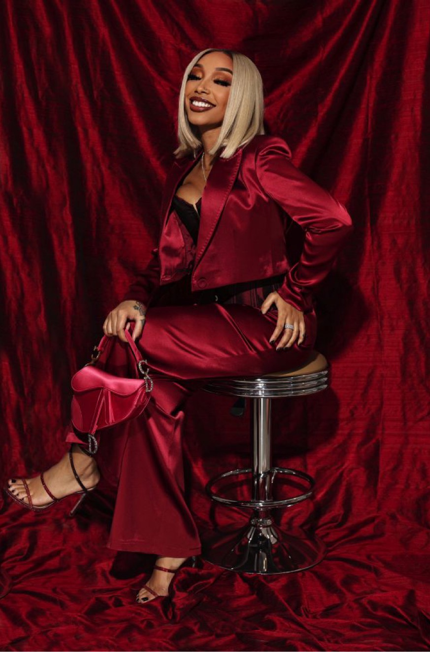 Zonnique stunned in a red custom Lafayette 148 New York cropped blazer and pants and Rene Caovilla sandals along with a Dior bag, styled by Jeremy Haynes.