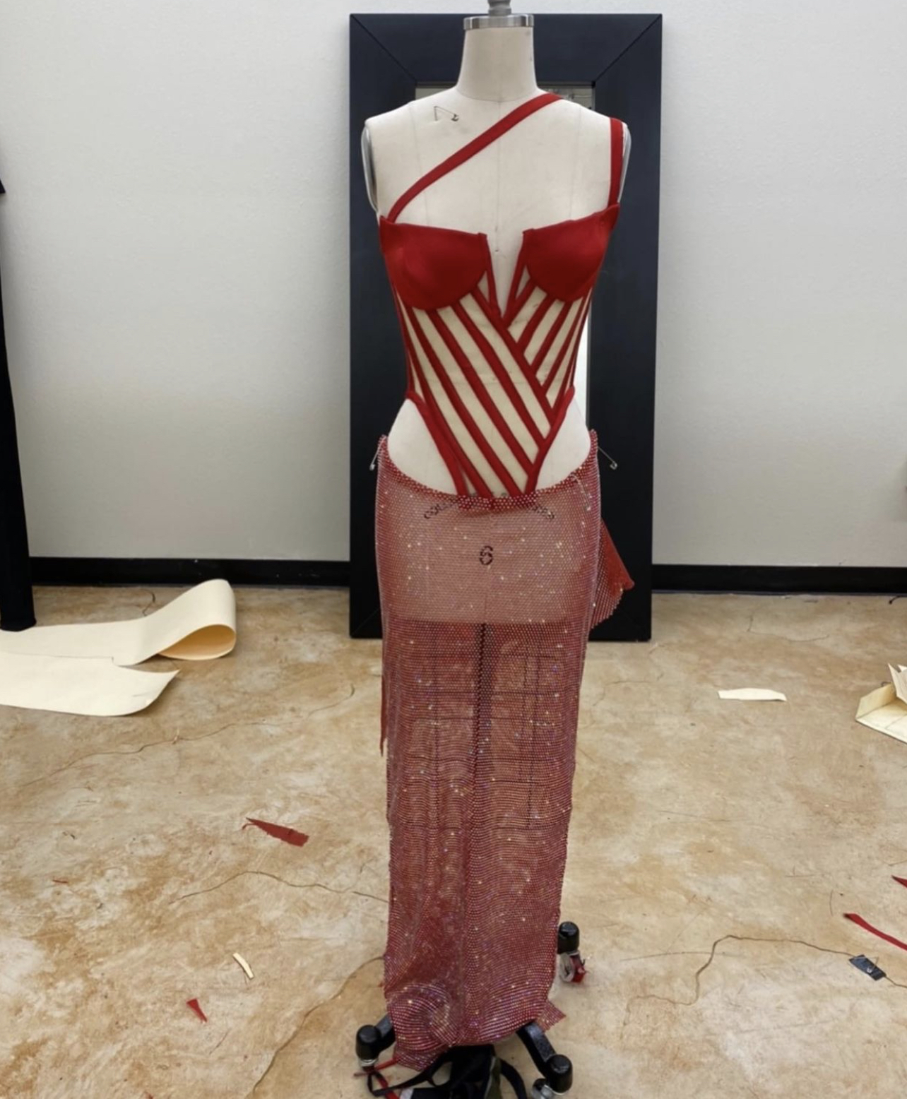 Yung Miami attended P’s after party wearing a custom look by Sir Baba Jagne, styled by Bryon Javar. Her look consisted of a pink crystal one shoulder corset top and low-rise maxi skirt. The corset top included a double one-shoulder strap complete with a classic lace-up detail in the back. The maxi skirt appeared in a sheer shimmering mesh fabric with a mid front slit for the finish.