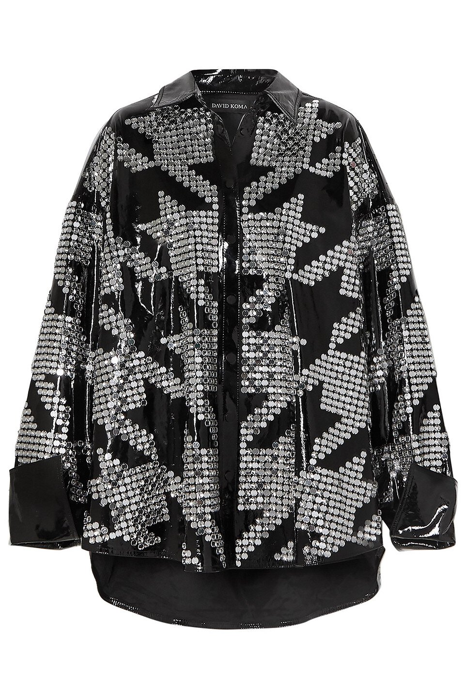 Beyoncé wore a David Koma Fall 2020 look, styled by Zerina Akers. Her look included the brand’s $723 strapless patent leather mini dress (sold out) and $3,264 embellished patent-leather shirt. For this particular look, she mixed pieces from the Fall 2020 collection. The embellished patent leather shirt actually comes with a matching skirt, however Beyoncé opted for the brand’s patent mini dress to allow the shirt to serve as the “wow” feature of the look.