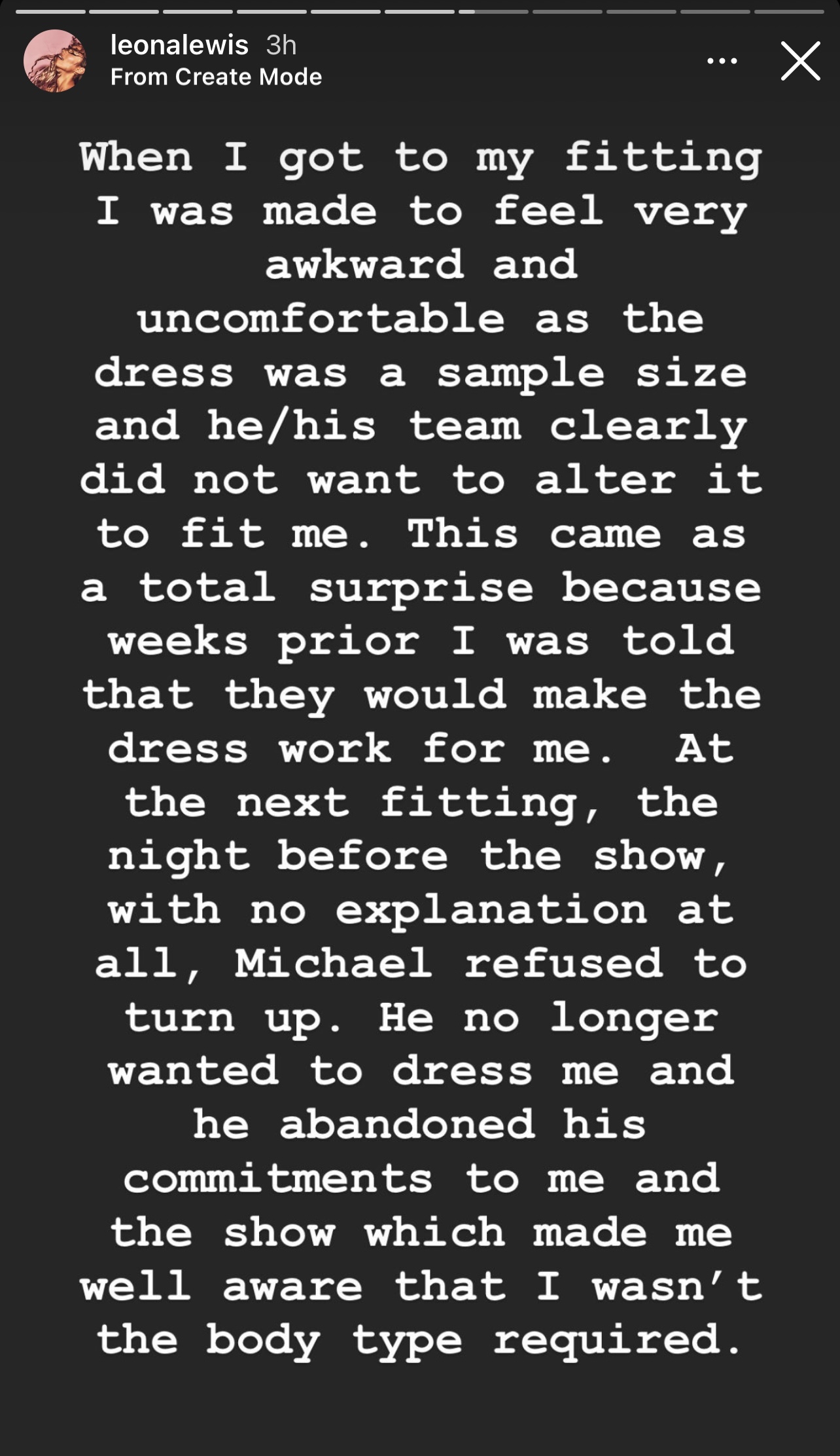 Singer Leona Lewis also shared her story today where she claimed she was booked to do a charity fashion with Michael Costello as her assigned designer of which he refused to work with her due to her body type. She states, “When I got to my fitting, I was made to feel very awkward and uncomfortable as the dress was a sample size and he/his team clearly did not want to alter it to fit me. This came as a total surprise because weeks prior I was told that they would make the dress work for me.” She proceeds, “At the next fitting , the night before the show, with no explanation at all, Michael refused to turn up. He no longer wanted to dress me and he abandoned his commitments to me and the show which made me well aware that I wasn’t the body type required.“