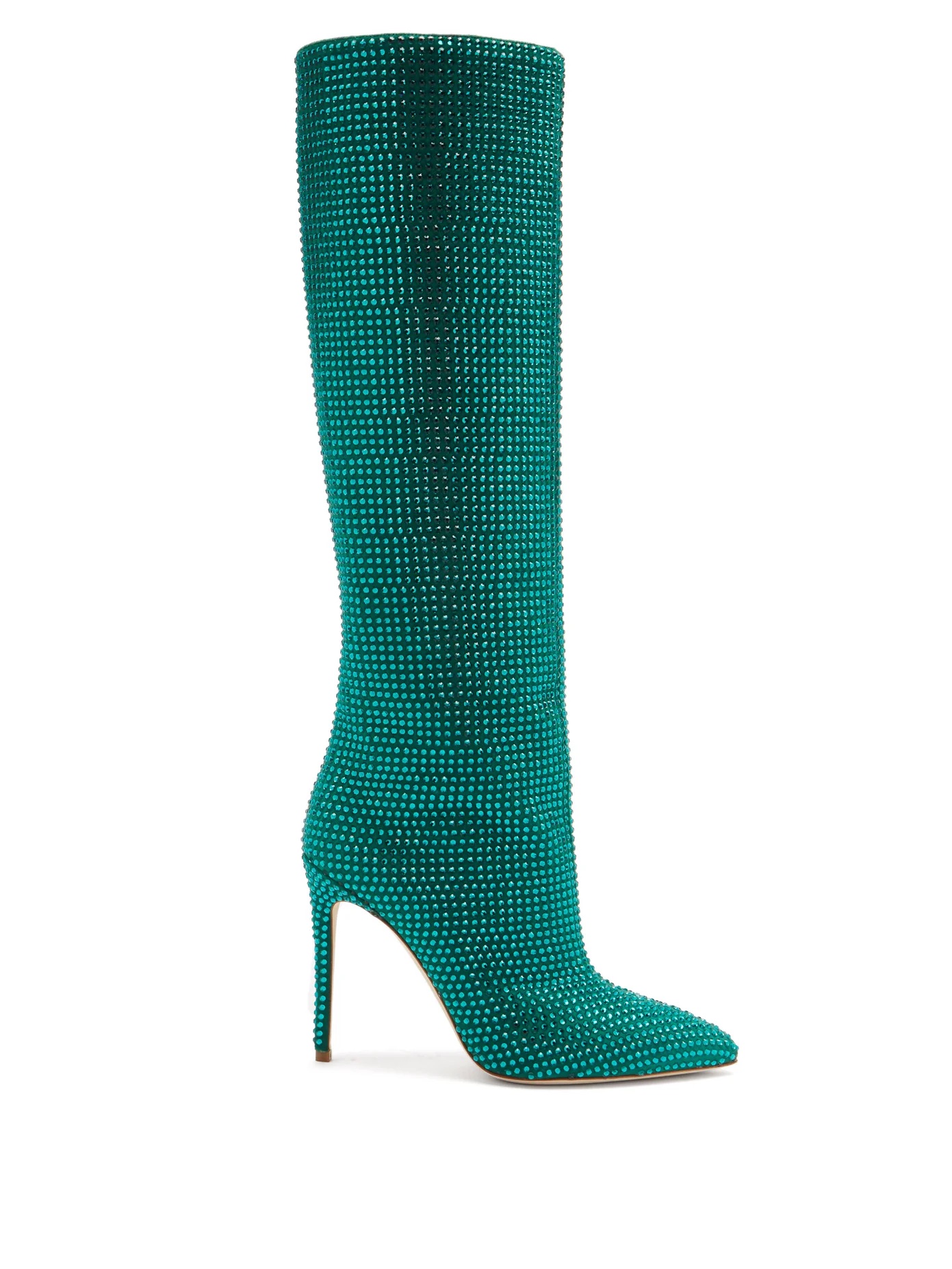 Eve stepped on the scene in an all-black look including a $531 Mugler embossed scuba bodysuit, sheer jacket, and leggings. She opted for a pop of color with a pair of $1,625 Paris Texas “Holly” crystal-embellished suede knee-high boots. She finished the look with Carolina Bucci jewelry. Eve styled herself for the event.