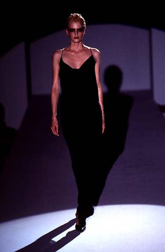 Khloe Kardashian wore a Gucci by Tom Ford Spring/Summer 1997 RTW black slinky low scoop neck dress and 1996 Black Spazzalato leather belt with slit buckle (available on Hush Hush for $575).