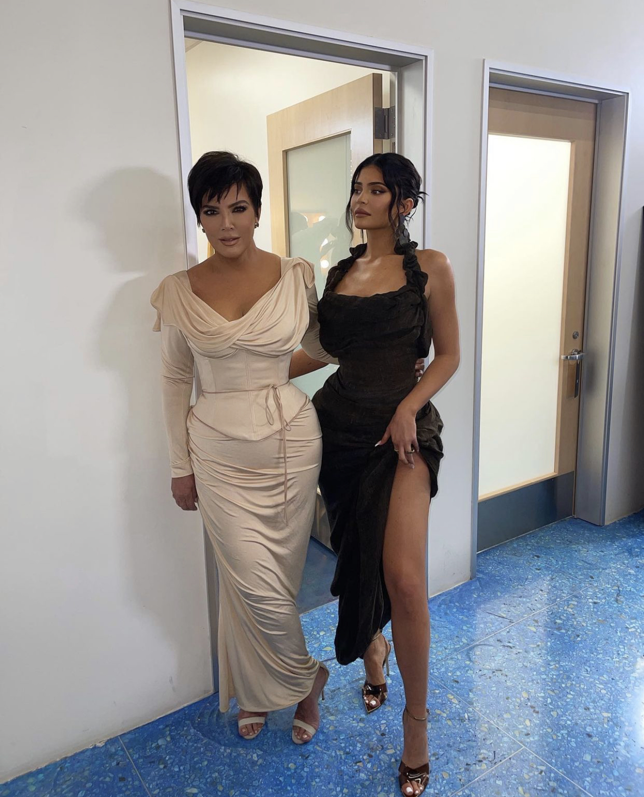 Kris Jenner posed with daughter Kylie Jenner wearing a custom white Vivienne Westwood dress.