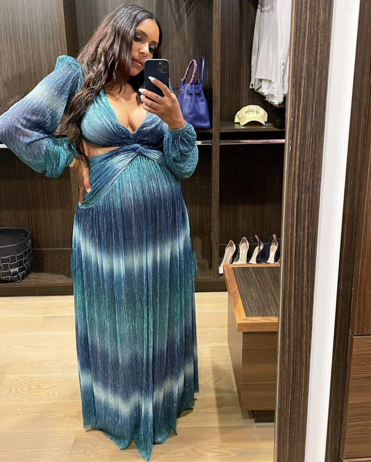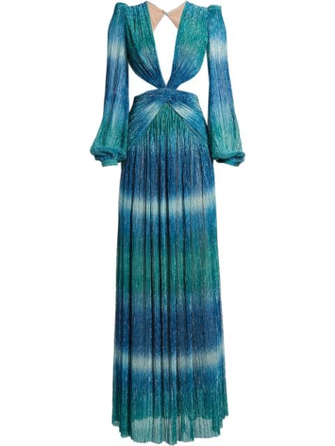 Eudoxie wore PatBo’s $1,100 ombré cutout maxi dress. The dress features many sexy elements including a plunging v-neckline along with a cutout detail on the sides and an open-back component as well. It appears in blue-green ombré pattern in a lurex fabric to achieve a metallic, aquatic-like look. She allowed the dress to steal the show with minimal jewelry, soft glam and simplistic body waves. Her look was styled by Paris Libby.