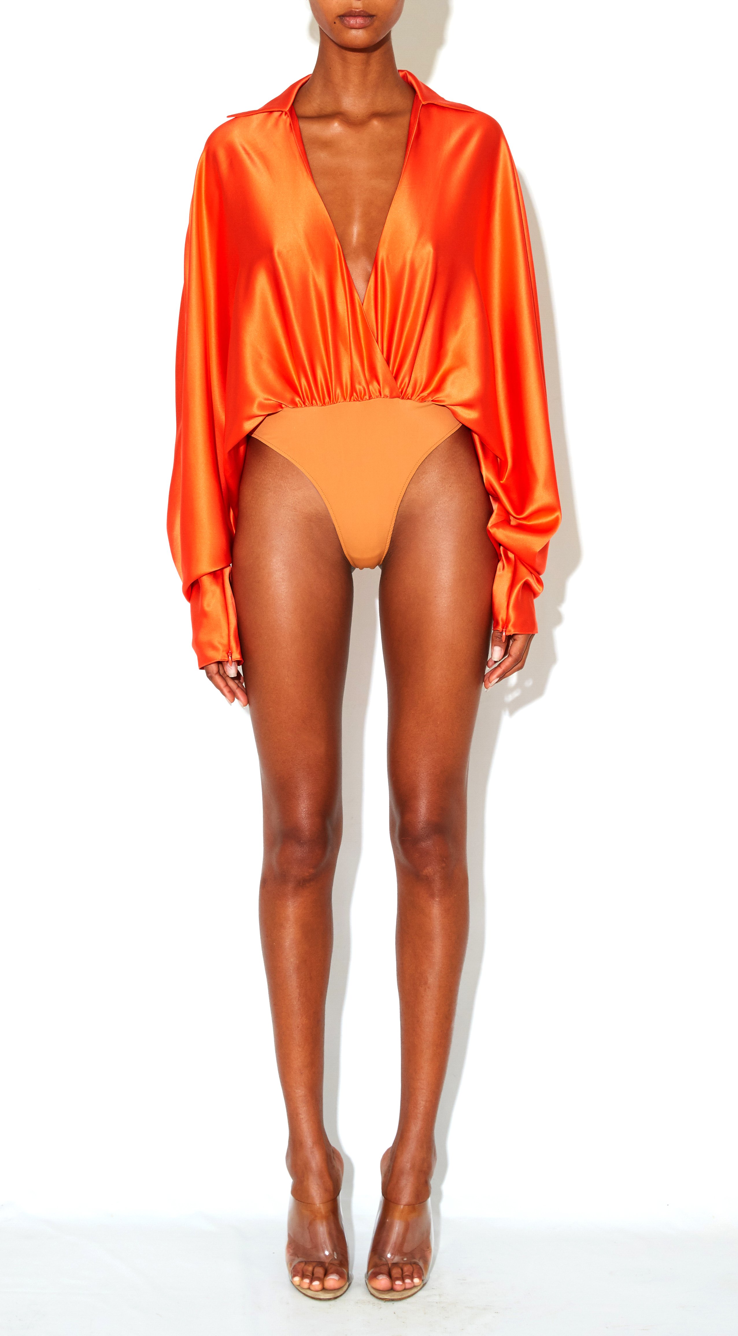 Rihanna promoted her latest Fenty Beauty product, Gloss Bomb Heat Universal Lip Luminizer wearing LaQuan Smith’s Tuxedo Bodysuit in hot orange and the Moto Pants. She wore a pair of hoop earrings and sported her wispy wavy mullet hairstyle along with a fiery makeup look including the newest Gloss Bomb to complete her look.