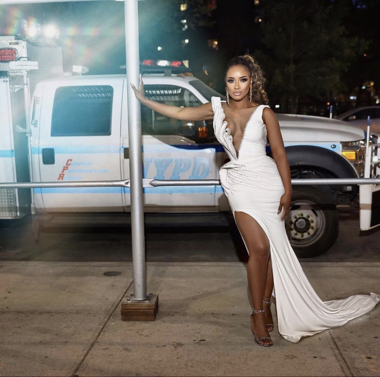 Dr. Heavenly Kimes attended the reunion in Couture Brides by Nona, styled by Jeremy Haynes. With its straps draping off the shoulder, the dress appears in a completely embellished design in a champagne color with a surprise feather ornament. She accessorized the look with a pair of Rene Caovilla heels.