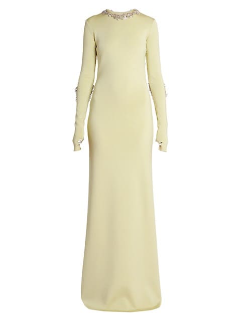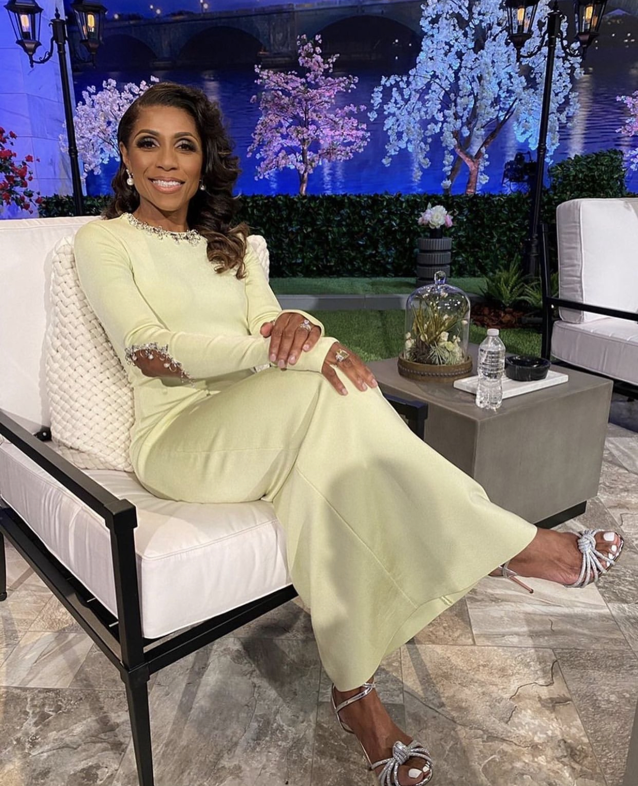 Dr. Jackie Walters appeared at the reunion in a $3,460 Givenchy Crystal-Trim Cutout Open-Back Gown and $1,250 Aquazzura Celeste Glitter Leather Sandals. The chic lemonade yellow dress displays cutout details on the elbows and back along with glistening jewel embellishments on the neckline, elbows and back as well, elevating this simple evening dress with luxe elements.