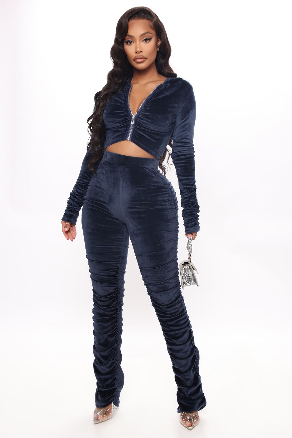 The Ruched All Over Velvet Legging Set is literally perfect for traveling, according the Megan Thee Stallion! She wore the set as she boarded her private flight to Vegas. With such stretchy velvet fabric, the set is pleasant for those cool flights as you head to your destination.