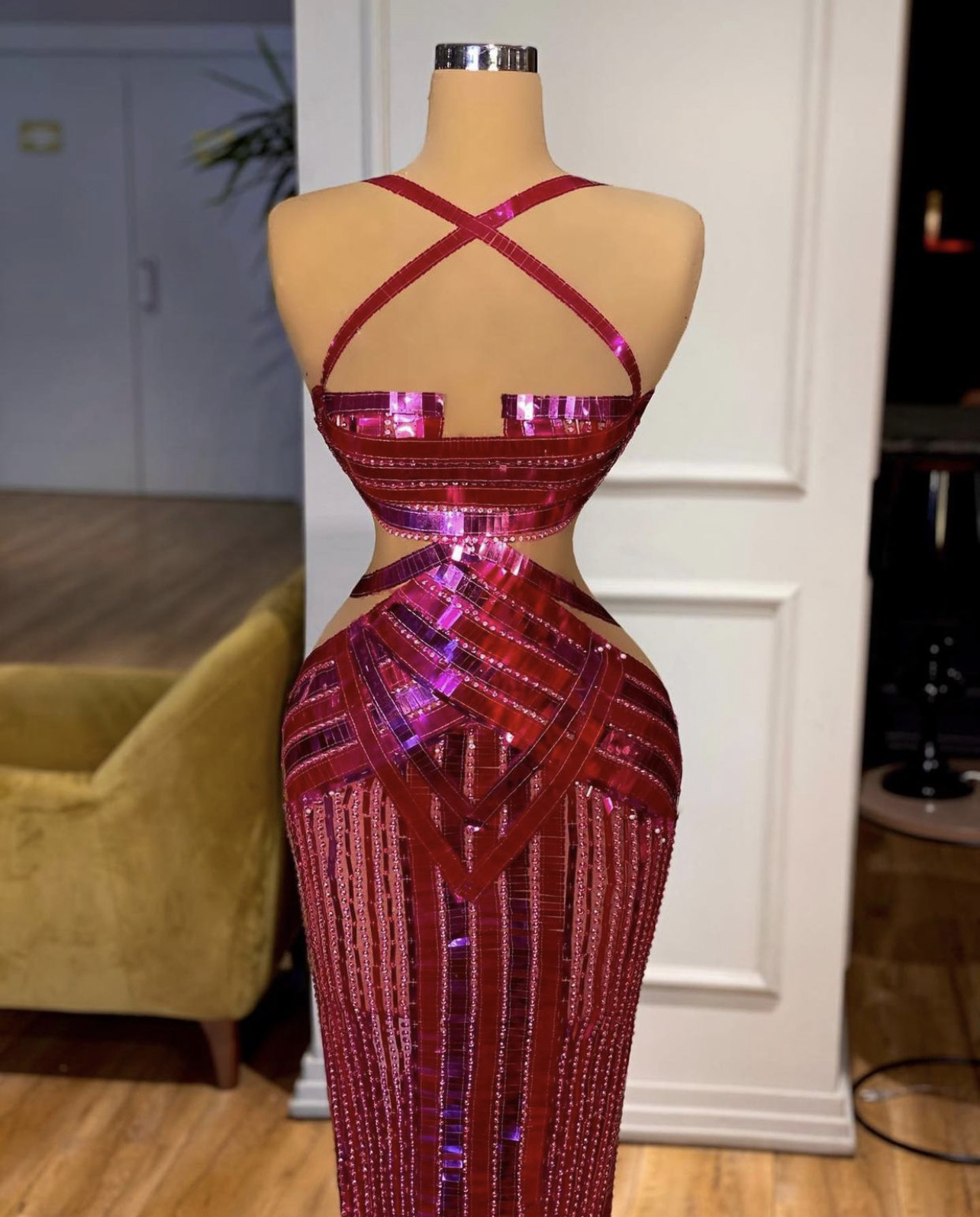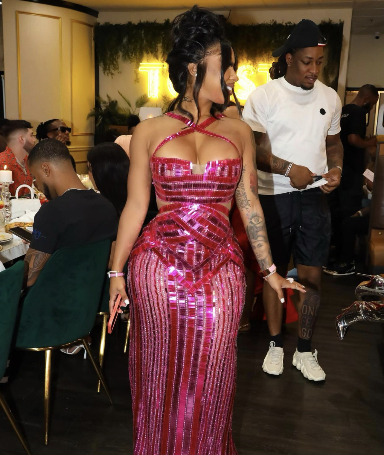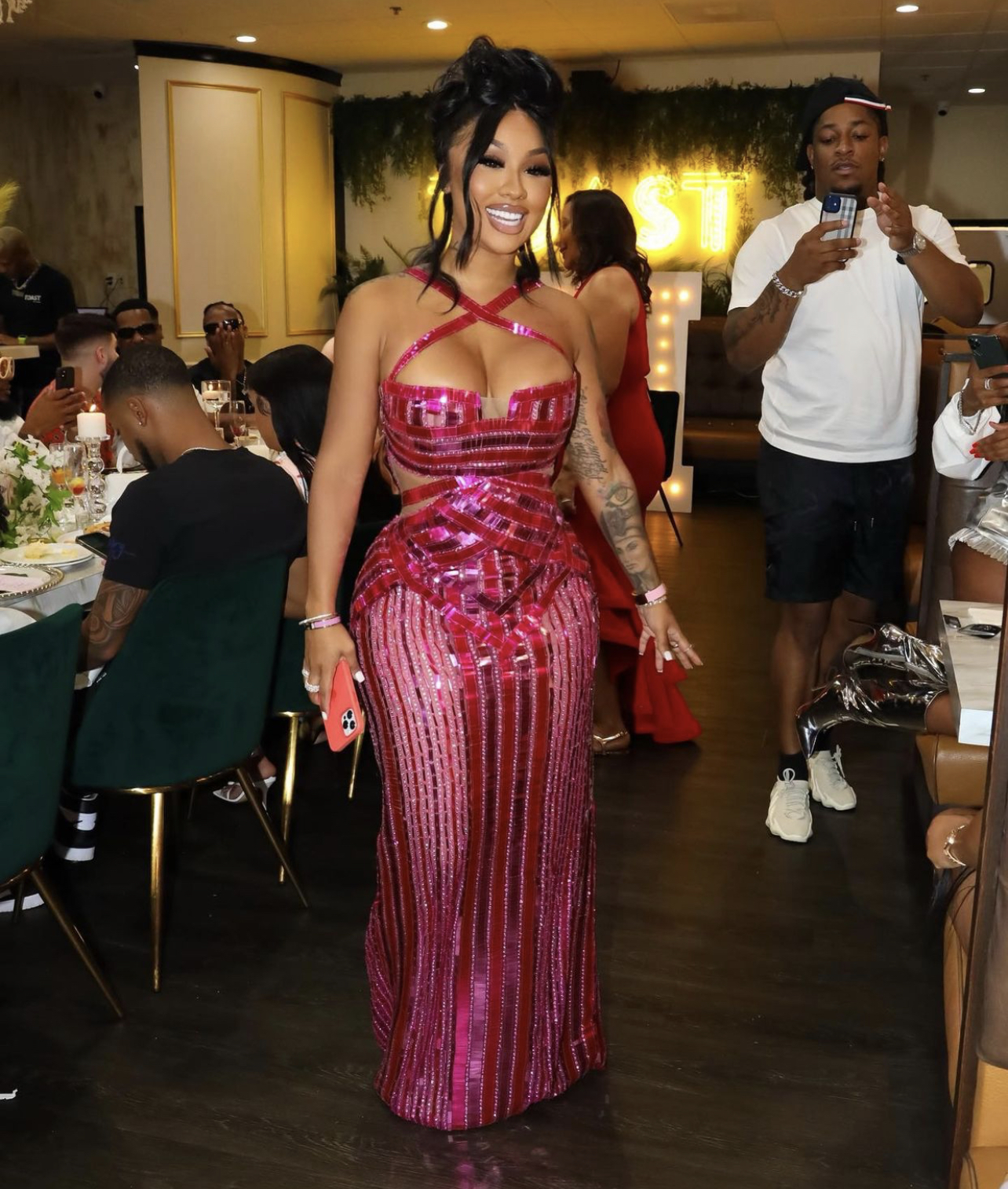 For her birthday brunch and during her trip to Dubai, Ari Fletcher wore Valdrin Sahiti gowns, curated by Benji Carlisle. Her first gown displays itself in a pink see-through embellished fabric with a halterneck and side cutouts. Styled by Arrogant Tae, her hair was worn in a curly updo for her look.