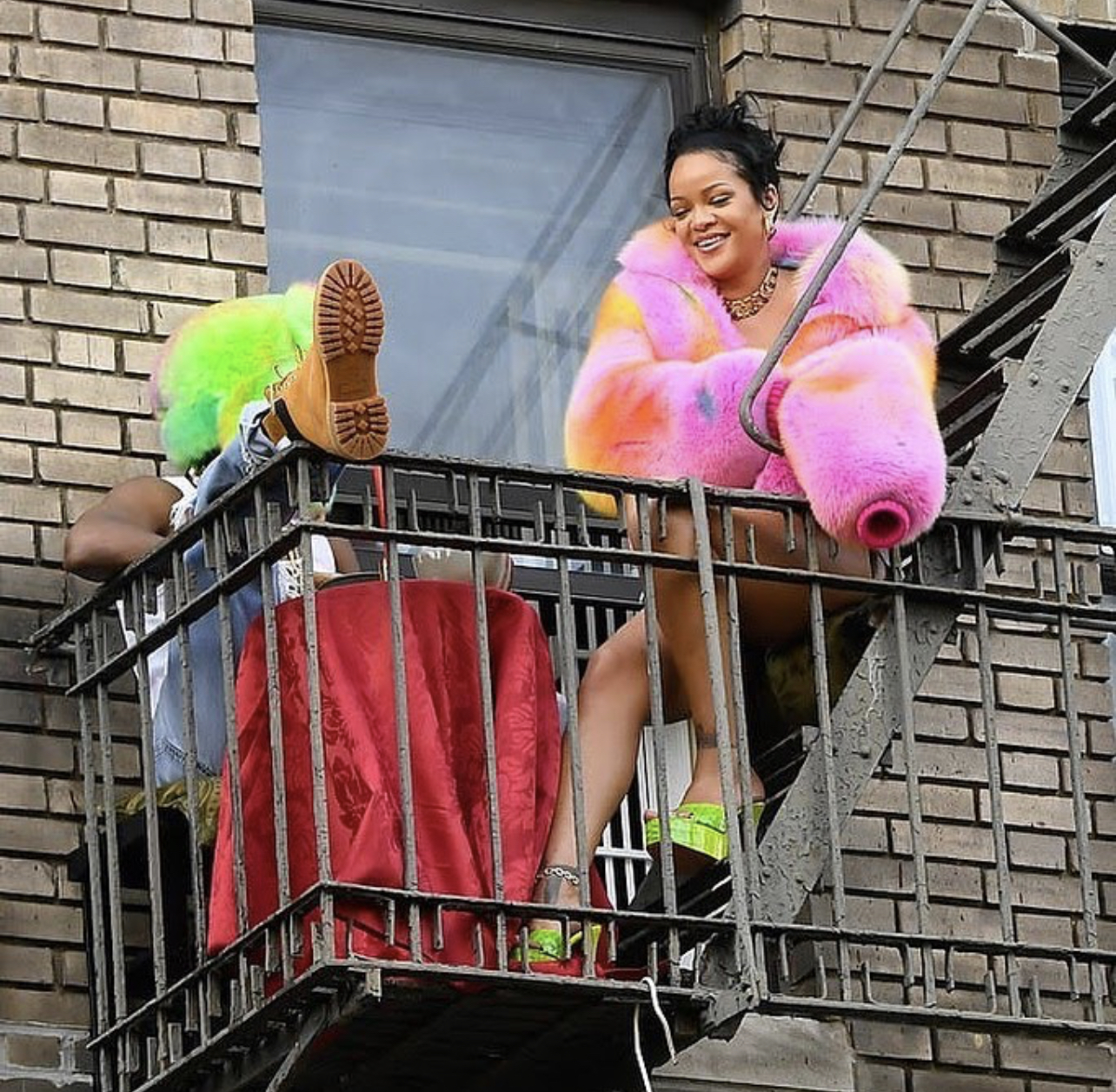 While filming a music video right in the streets of NY, Rihanna and A$AP Rocky had the internet in shambles as everyone swooned over the two fashion stars’ looks. While they were spotted in many looks that day, the colorful fur look seemed to be everyone’s fave. Rihanna and A$AP Rocky both wore tie-dye neon fur pieces from Virgil Abloh’s Spring/Summer 2022 RTW menswear collection. A$AP Rocky wore what appeared to be a fur trapper from the brand while Rihanna opted for the fur jacket and $845 Amina Muaddi “Dalida” green embossed croc mules (unavailable in this colorway). Rihanna also accessorized her look with rings by Briony Raymond.